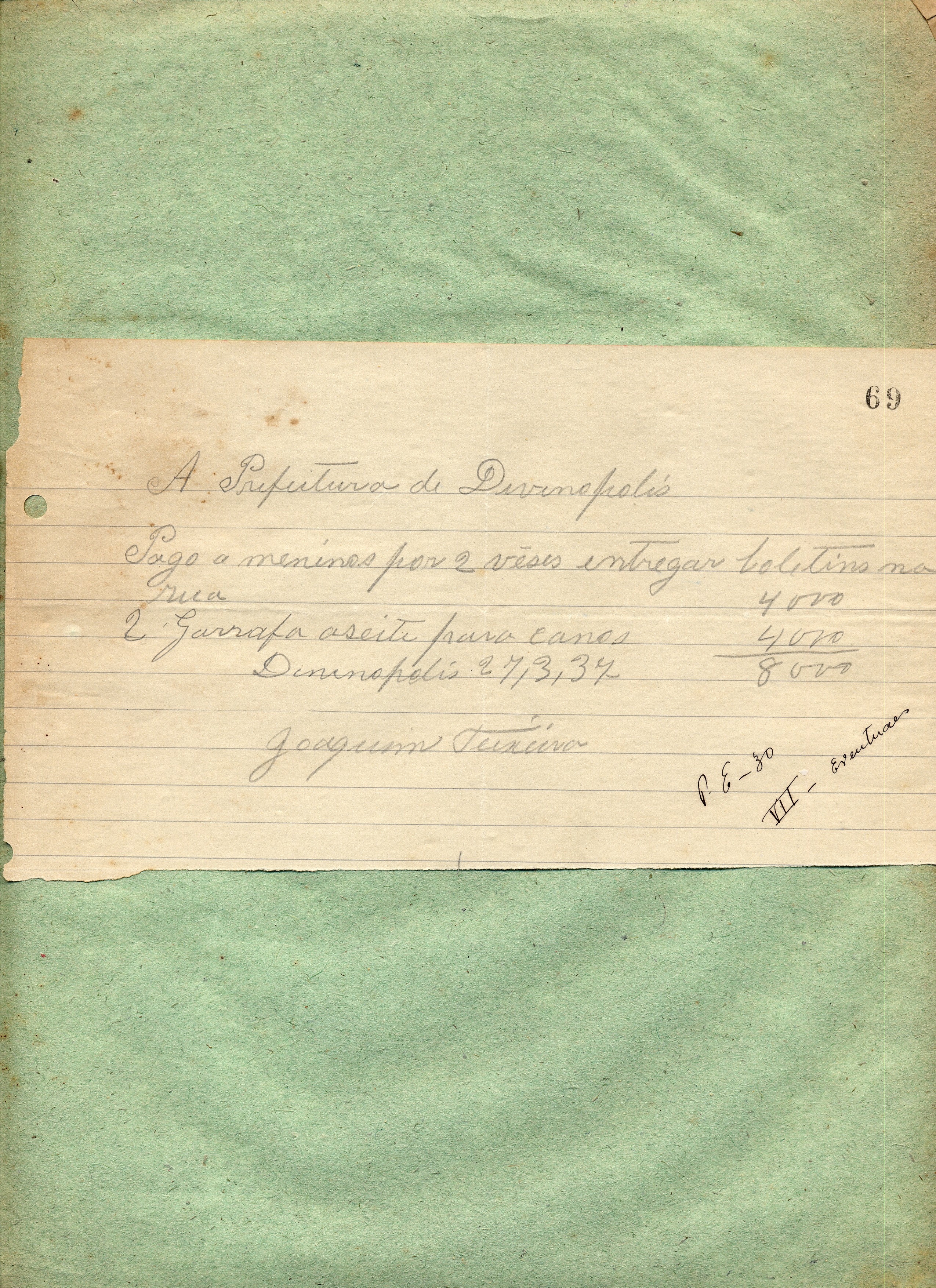 PAGUE-SE AO SNR. JOAQUIM TEIXEIRA DE ACORDO COM A RESOLUÇÃO Nº 02 DE 29 DE SETEMBRO DE 1936, PELA VERBA VII- EVENTUAIS - ENTREGA DE BOLETINS DE AVISOS A QUANTIA DE 8$000 (OITO MIL RÉIS).