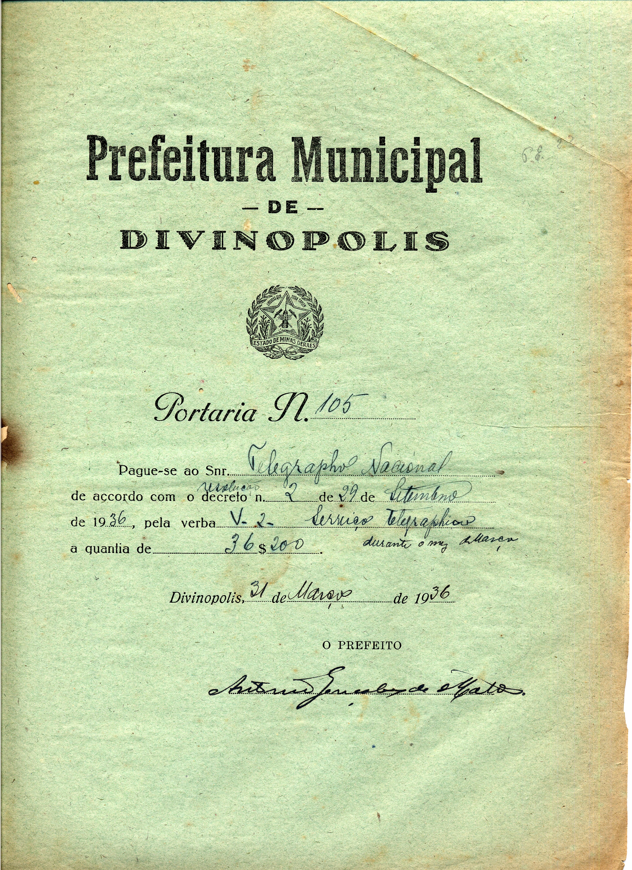 PAGUE-SE AO SNR. TELÉGRAPHO(SIC) NACIONAL DE ACORDO COM A RESOLUÇÃO Nº 02 DE 29 DE SETEMBRO DE 1936, PELA VERBA V-2 SERVIÇO TELEGRÁPHICO DURANTE O MÊZ(SIC) DE MARÇO A QUANTIA DE 36$200 (TRINTA E SEIS MIL E DUZENTOS RÉIS).