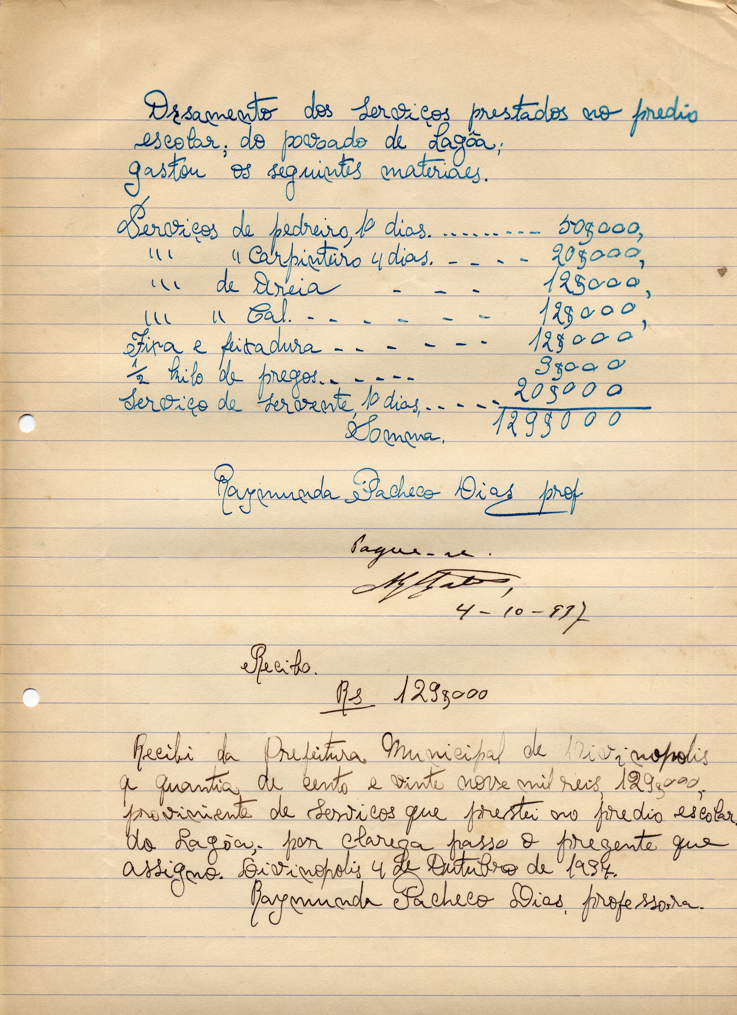 PAGUE-SE AO SNR. RAYMUNDO PACHECO DIAS DE ACORDO COM O DECRETO Nº __DE__ DE___DE 19__(SIC), PELA VERBA II-E-1-B - REPAROS NO PRÉDIO ESCOLAR DE LAGOA A QUANTIA DE 129$000 (CENTO E VINTE E NOVE MIL RÉIS).