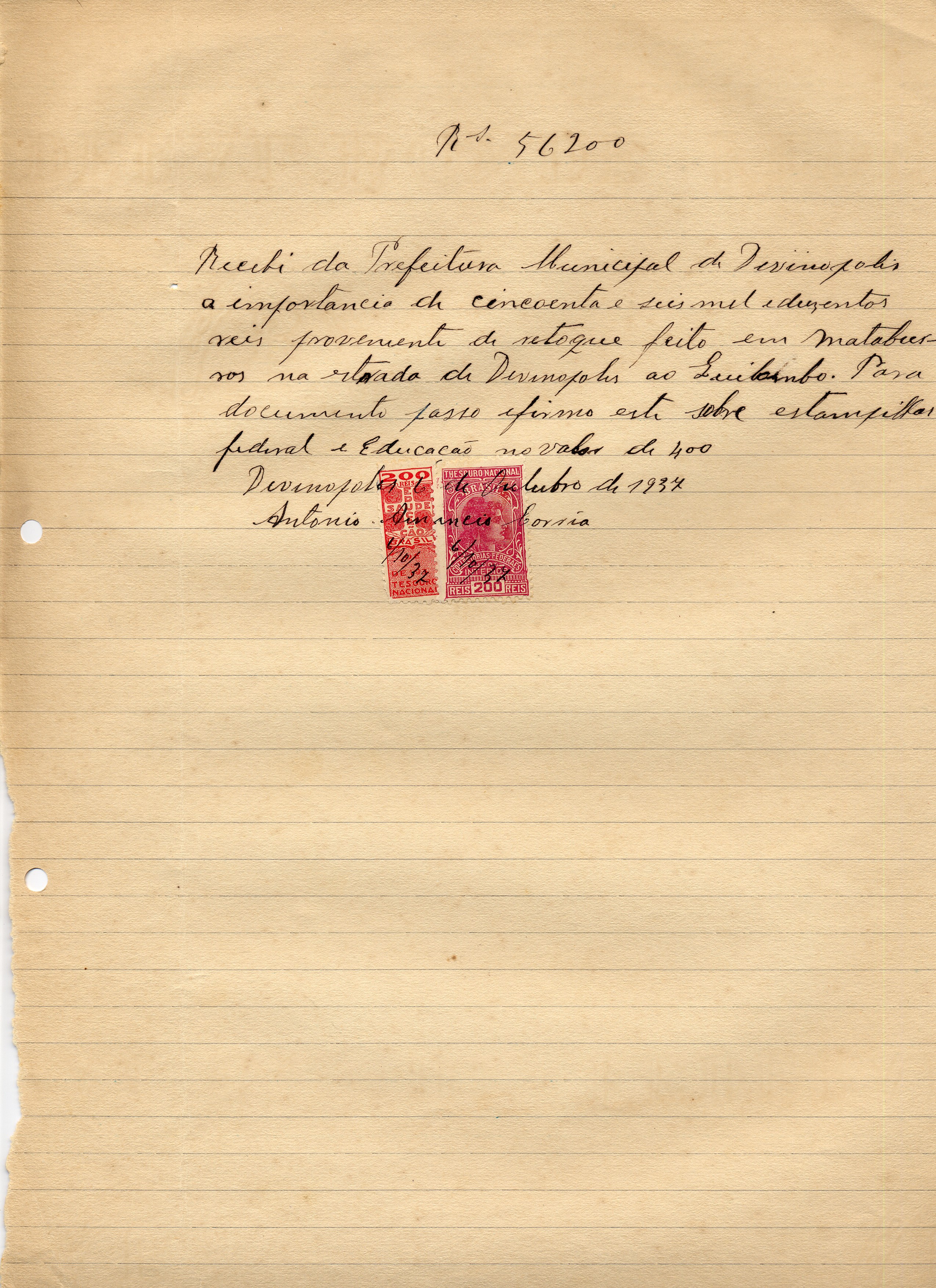 PAGUE-SE AO SNR. ANTONIO AMÂNCIO CORRÊA DE ACORDO COM O DECRETO Nº __DE__ DE___DE 19__(SIC), PELA VERBA III- B- 4 - RETOQUE NOS MATA- BURROS DA ESTRADA DIVINÓPOLIS-QUILOMBO, A QUANTIA DE 56$200 (CINQUENTA E SEIS MIL E DUZENTOS RÉIS).