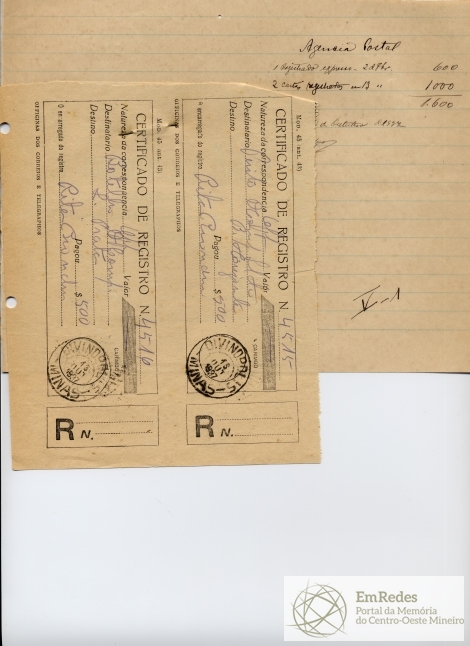 PAGUE-SE AO SR. AGÊNCIA POSTAL DE ACCORDO(SIC) COM O DECRETO Nº _____DE_____DE__________DE 19____(SIC), PELA VERBA V-1- REGISTRO DE CORREPONDÊNCIA, A QUANTIA DE 1$600 (HUM MIL E SEISCENTOS RÉIS).