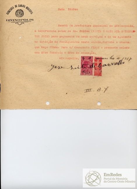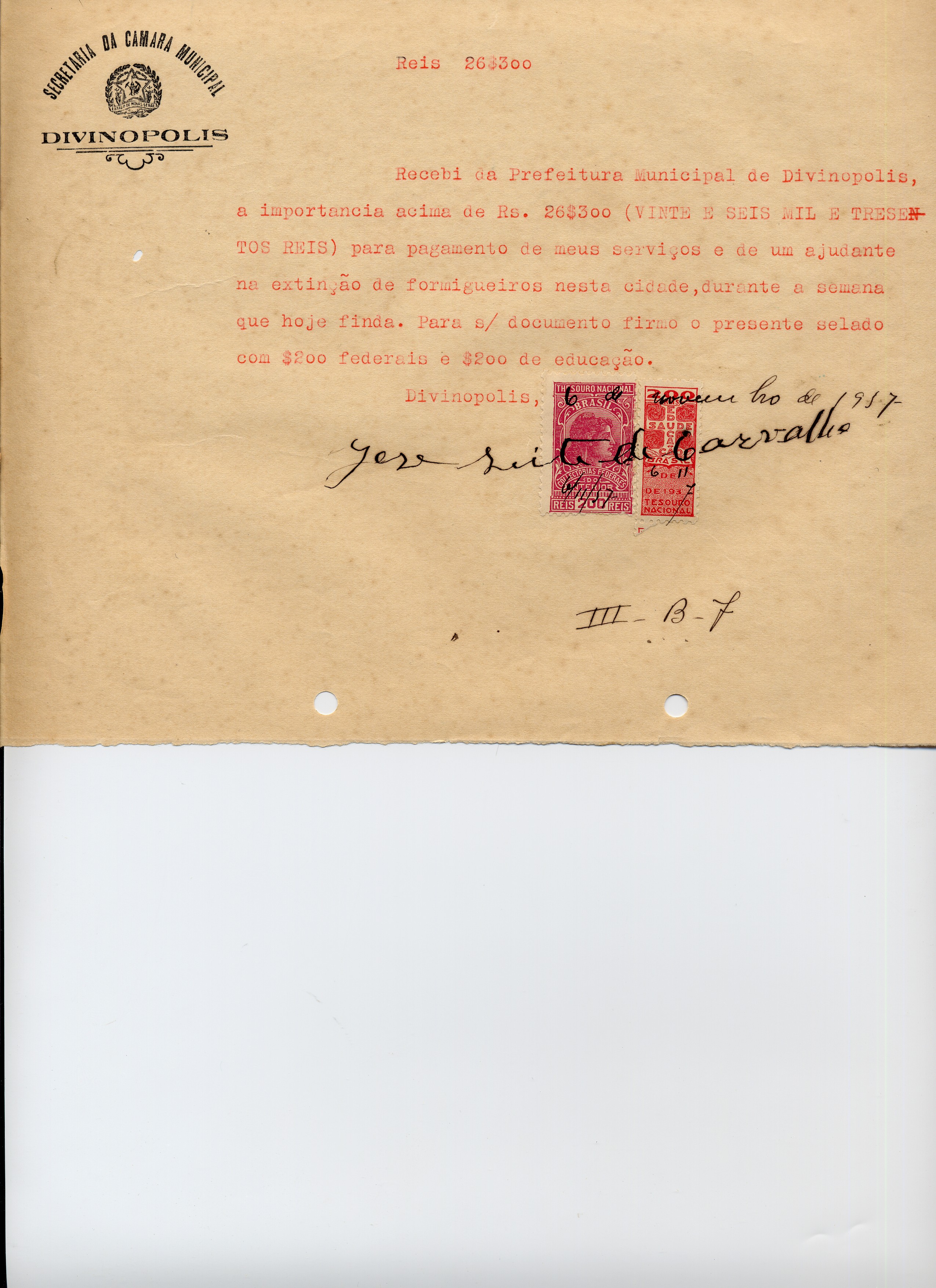 PAGUE-SE AO SR. JOSÉ LEITE DE CARVALHO DE ACCORDO(SIC) COM O DECRETO Nº _____DE_____DE__________DE 19____(SIC), PELA VERBA III- B- 7 - EXTINÇÃO DE FORMIGUEIROS A QUANTIA DE 26$300 (VINTE E SEIS MIL E TREZENTOS RÉIS).