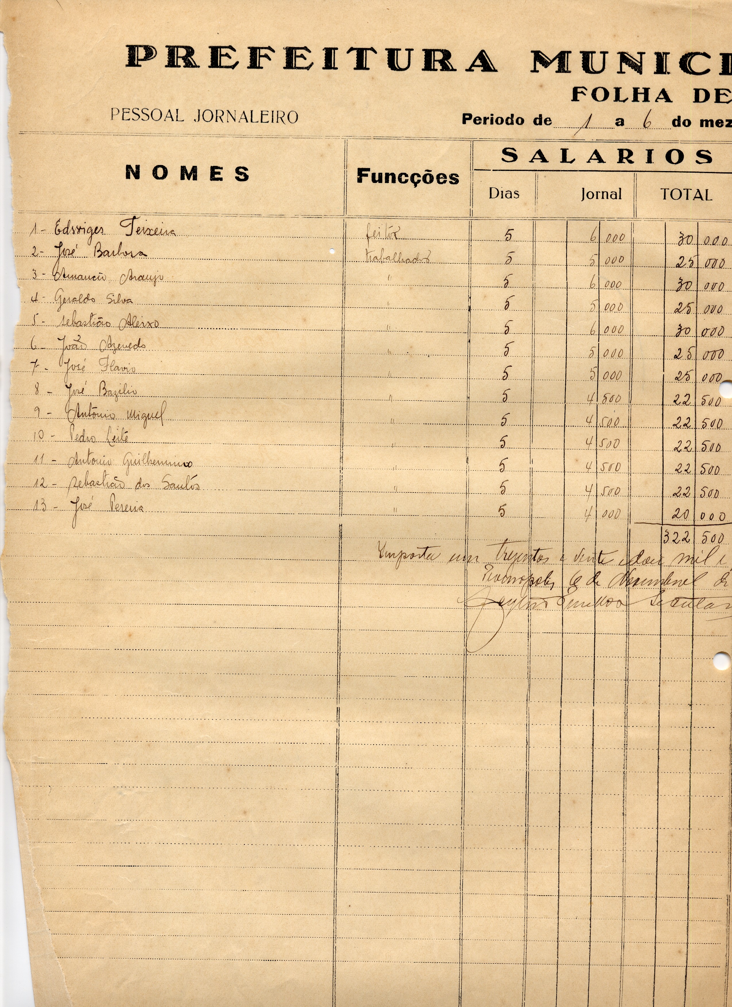 PAGUE-SE AO SR. PESSOAL OPERÁRIO DE ACCORDO(SIC) COM O DECRETO Nº _____DE_____DE__________DE 19____(SIC), PELA VERBA III-A2-5 -CONS. DE RUAS E JARDINS E COSNT. M/FIO(SIC) A QUANTIA DE 322$500 (TREZENTOS E VINTE E DOIS MIL E QUINHENTOS RÉIS).