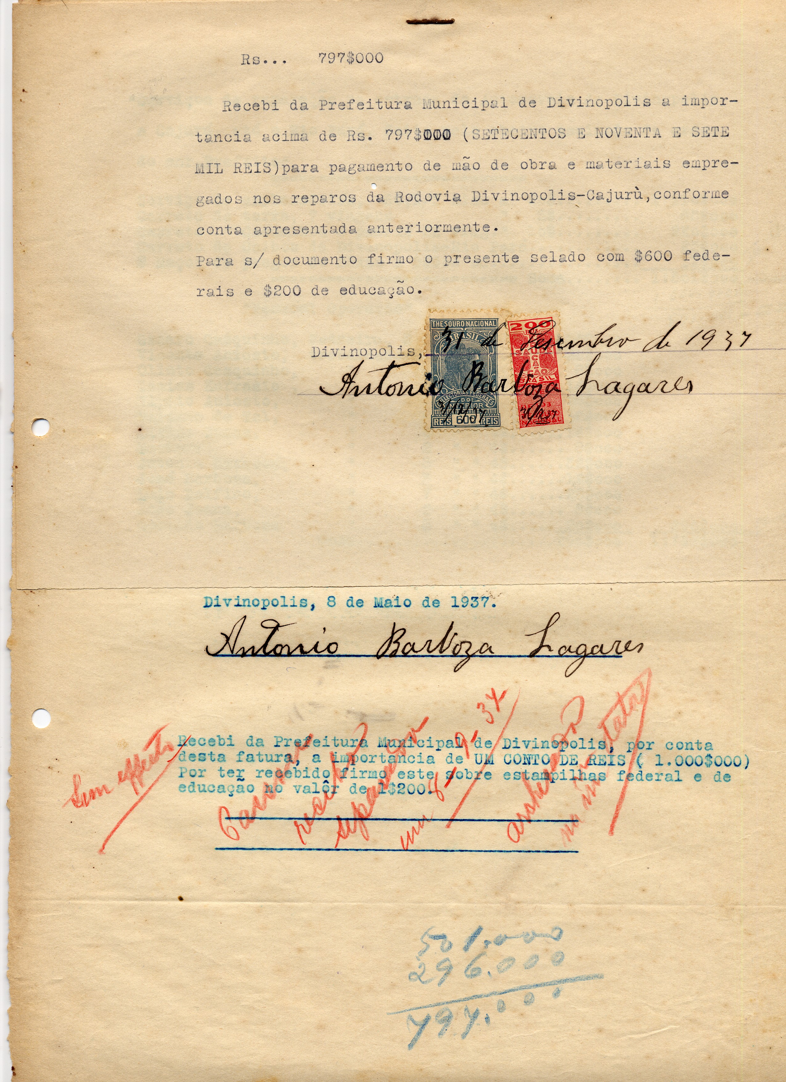 PAGUE-SE AO SNR. ANTONIO BARBOZA LAGARES DE ACORDO COM O DECRETO Nº____DE____DE_____DE 19___(SIC), PELAS VERBAS ABAIXO DISCRIMINADAS - REPAROS NA ESTRADA DE CAJURU DE DIVINÓPOLIS AO RIO PARÁ, QUANTIA DE 797$000 (SETECENTOS E NOVENTA E SETE MIL RÉIS).