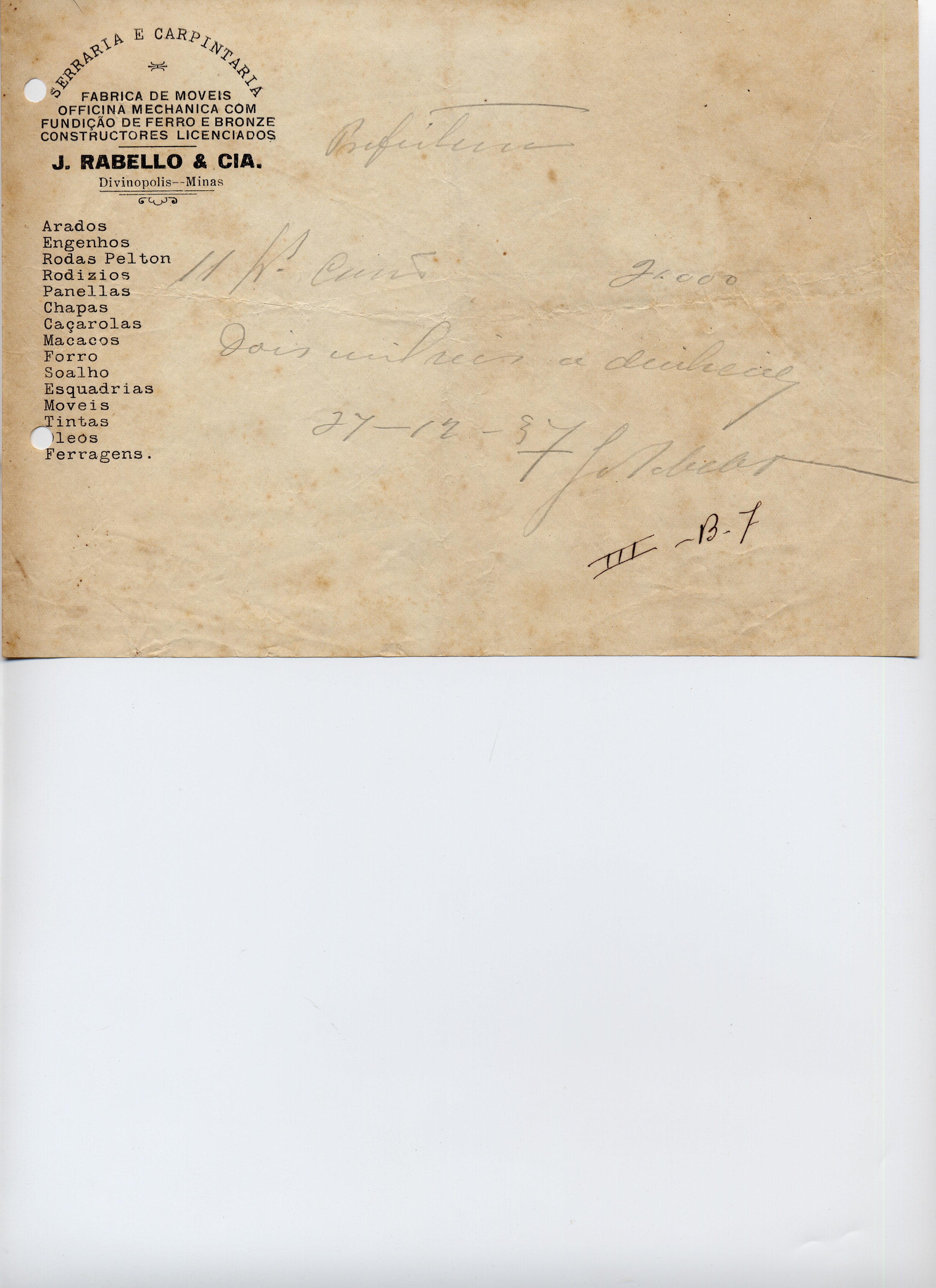PAGUE-SE AO SNR. J. RABELLO & CIA DE ACORDO COM O DECRETO Nº____DE____DE_____DE 19___(SIC), PELA VERBA III-B7-- CARVÃO Pª A EXTINÇÃO DE FORMIGUEIROS, A QUANTIA DE 2$000 (DOIS MIL RÉIS).