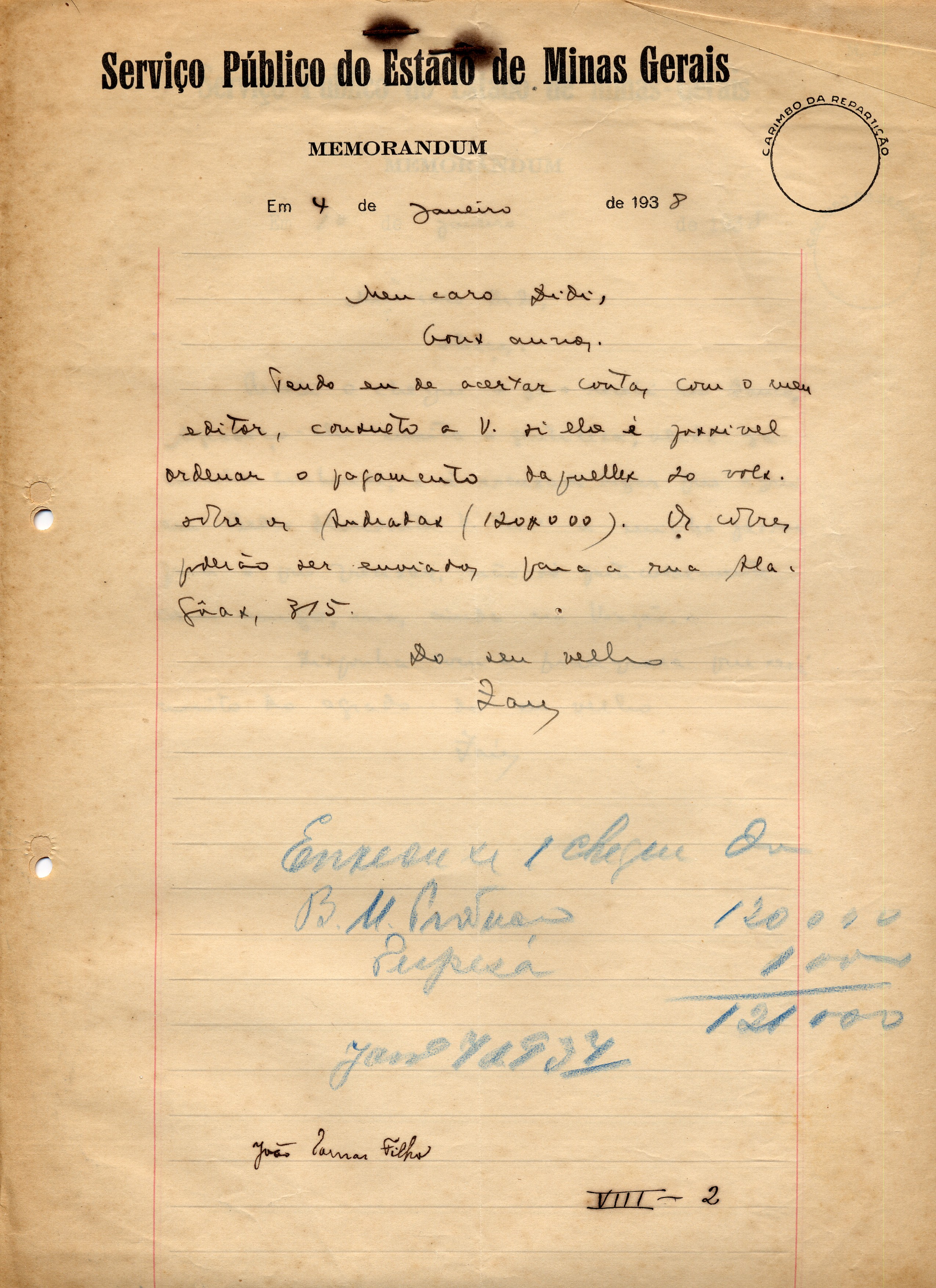 PAGUE-SE AO SR. JOÃO DORMAS FILHO DE ACCORDO(SIC) COM O DECRETO Nº 3 DE 08 DE JANEIRO 1938, PELA VERBA VII- 2-20 LIVROS - DESPESA BANCO A QUANTIA DE 121$000 ( CENTO E VINTE E UM MIL RÉIS).