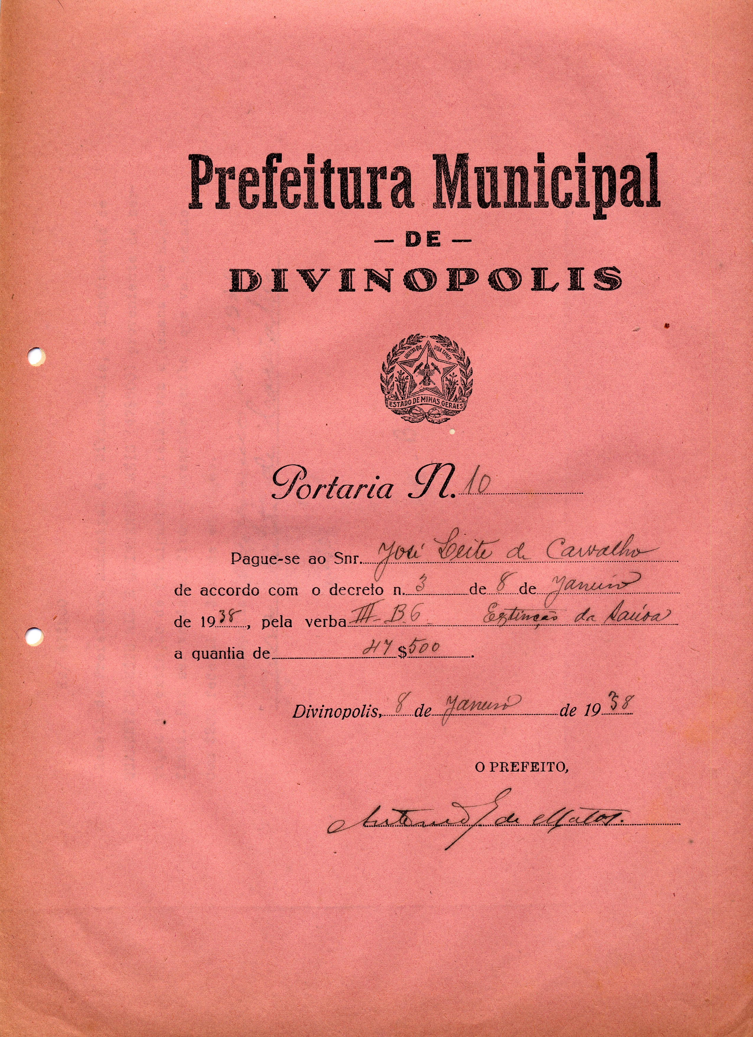 PAGUE-SE AO SR. JOSÉ LEITE DED CARVALHO DE ACCORDO(SIC) COM O DECRETO Nº 3 DE 08 DE JANEIRO 1938, PELA VERBA III- B-6 - EXTINÇÃO DA SAÚVA A QUANTIA DE 47$500 (QUARENTA E SETE MIL E QUINHENTOS RÉIS).
