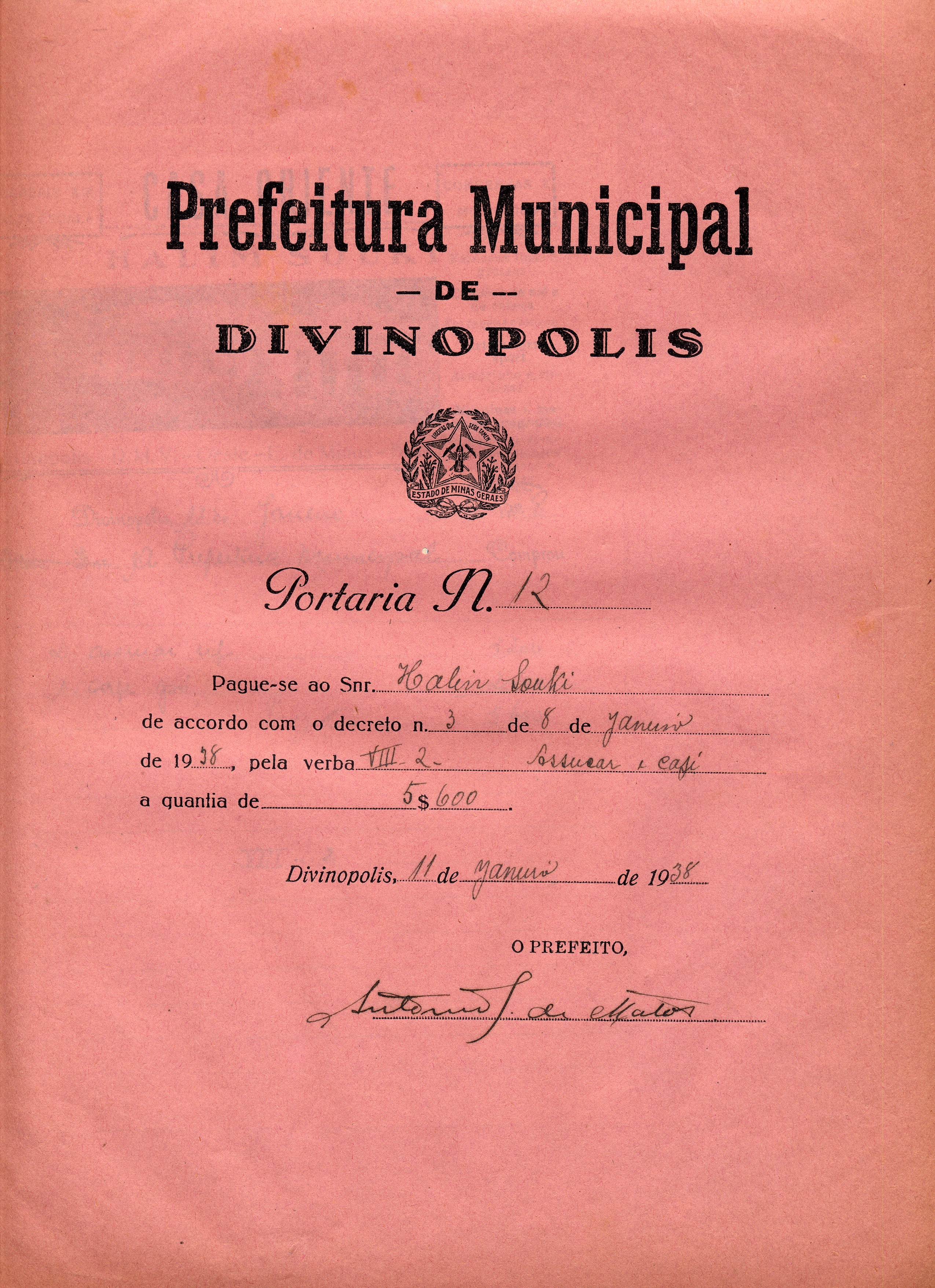 PAGUE-SE AO SR.HALIM SOUKI DE ACCORDO(SIC) COM O DECRETO Nº 3 DE 08 DE JANEIRO 1938, PELA VERBA VII - 2 ASSUCAR(SIC) E CAFÉ A QUANTIA DE 5$600 (CINCO MIL E SEISCENTOS RÉIS).