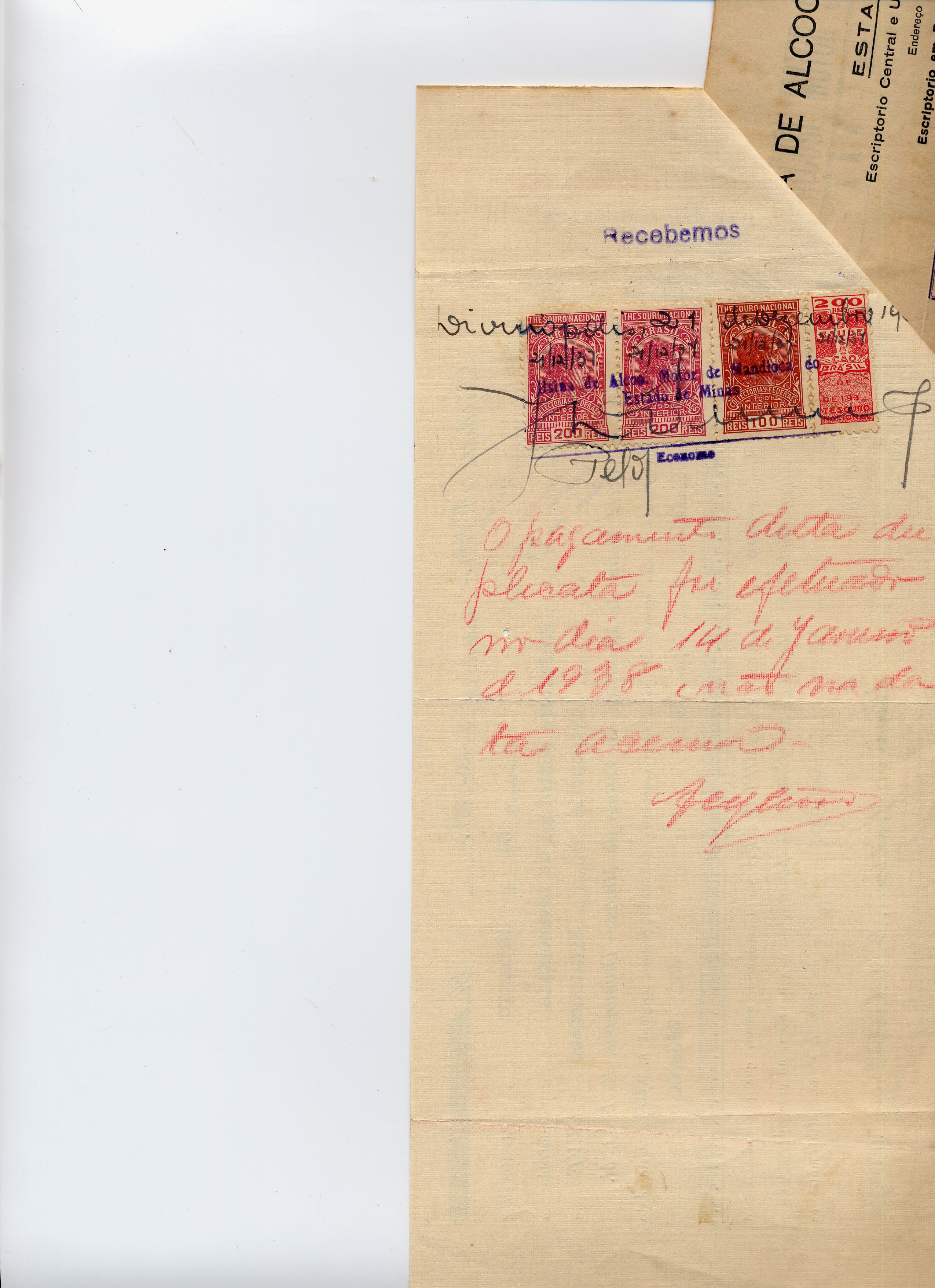 PREFEITURA MUNICIPAL DE DIVINÓPOLIS PORTARIA Nº 016 PAGUE-SE AO SR. USINA DE ÁLCOOL- MOTOR DE ACCORDO(SIC) COM O DECRETO Nº 3 DE 08 DE JANEIRO 1938, PELA VERBA II- B2- AMORTISAÇÃO(SIC) DE DÍVIDA FLUTUANTE - 937 A QUANTIA DE 360$000 (TREZENTOS E SESSENTA MIL RÉIS). PREFEITO: ANTONIO GONÇALVES DE MATOS. OBS: RECIBO REFERENTE A COMPRA DE 400 LITROS DE ÁLCOOL.
