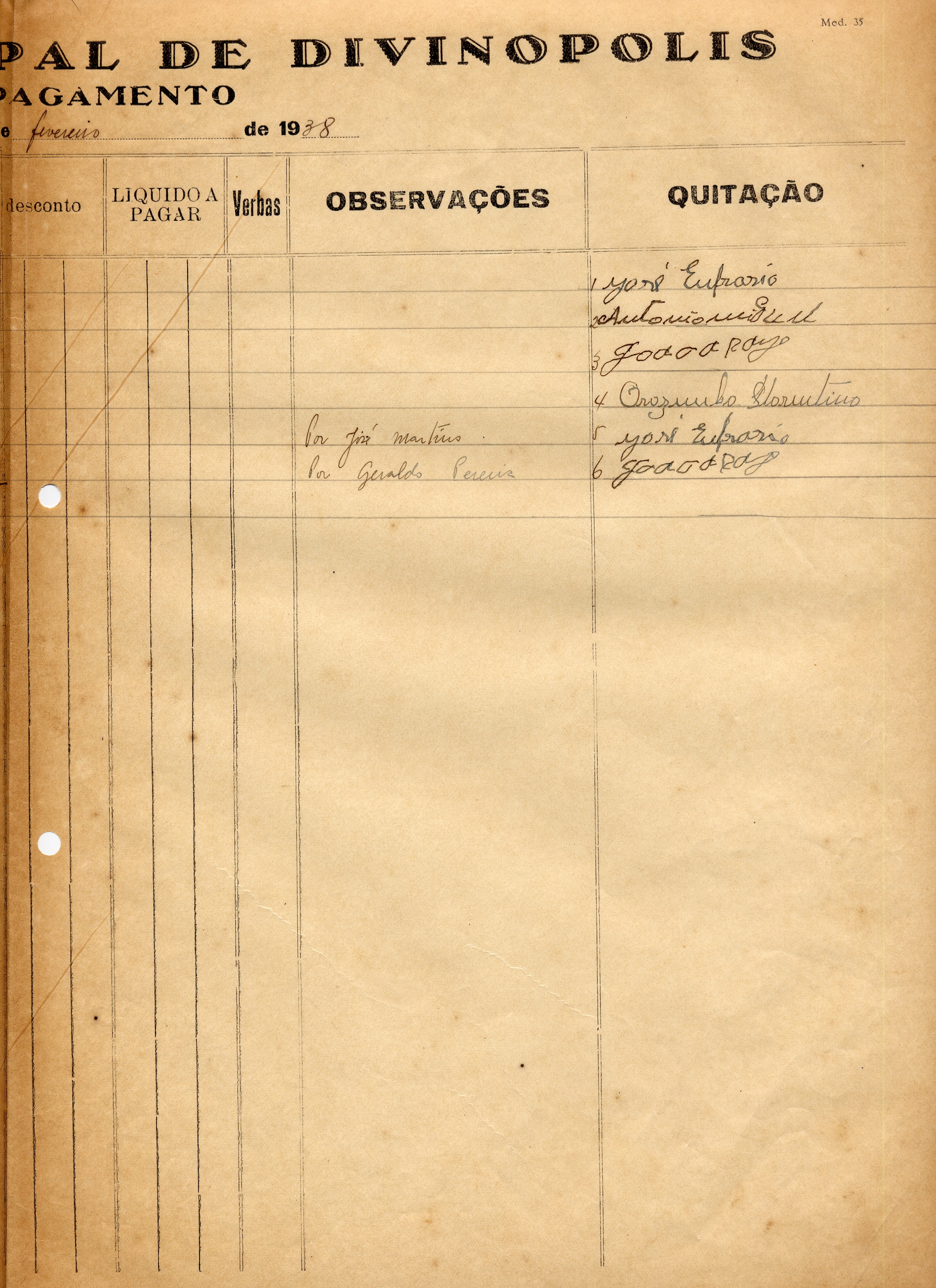 OBS: RECIBO REFERENTE AOS FUNCIONÁRIOS DA PREFEITURA RELATIVO A 02 A 05 DO MÊS DE FEVEREIRO DE 1938.