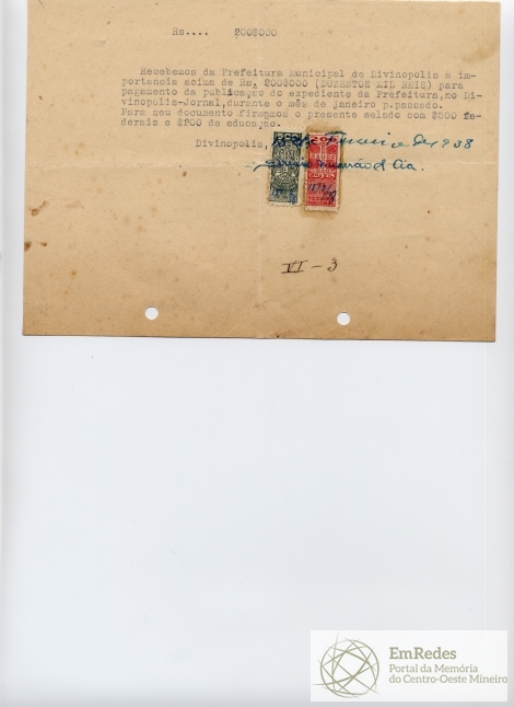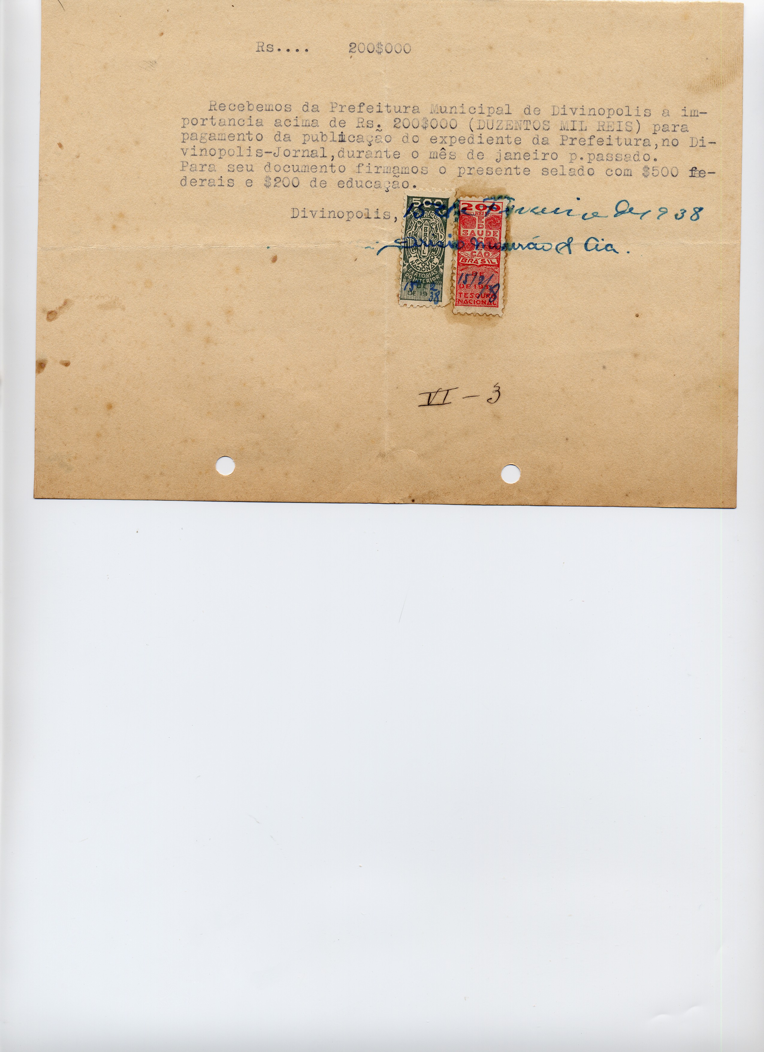 PAGUE-SE AO SNR.ARÍSIO MOURÃO E CIA DE ACCORDO COM O DECRETO N.º 3 DE 08 DE JANEIRO DE 1938, PELA VERBA VI-3 PUBLICAÇÃO DO EXPEDIENTE , A QUANTIA DE 200$000 (DUZENTOS MIL RÉIS)