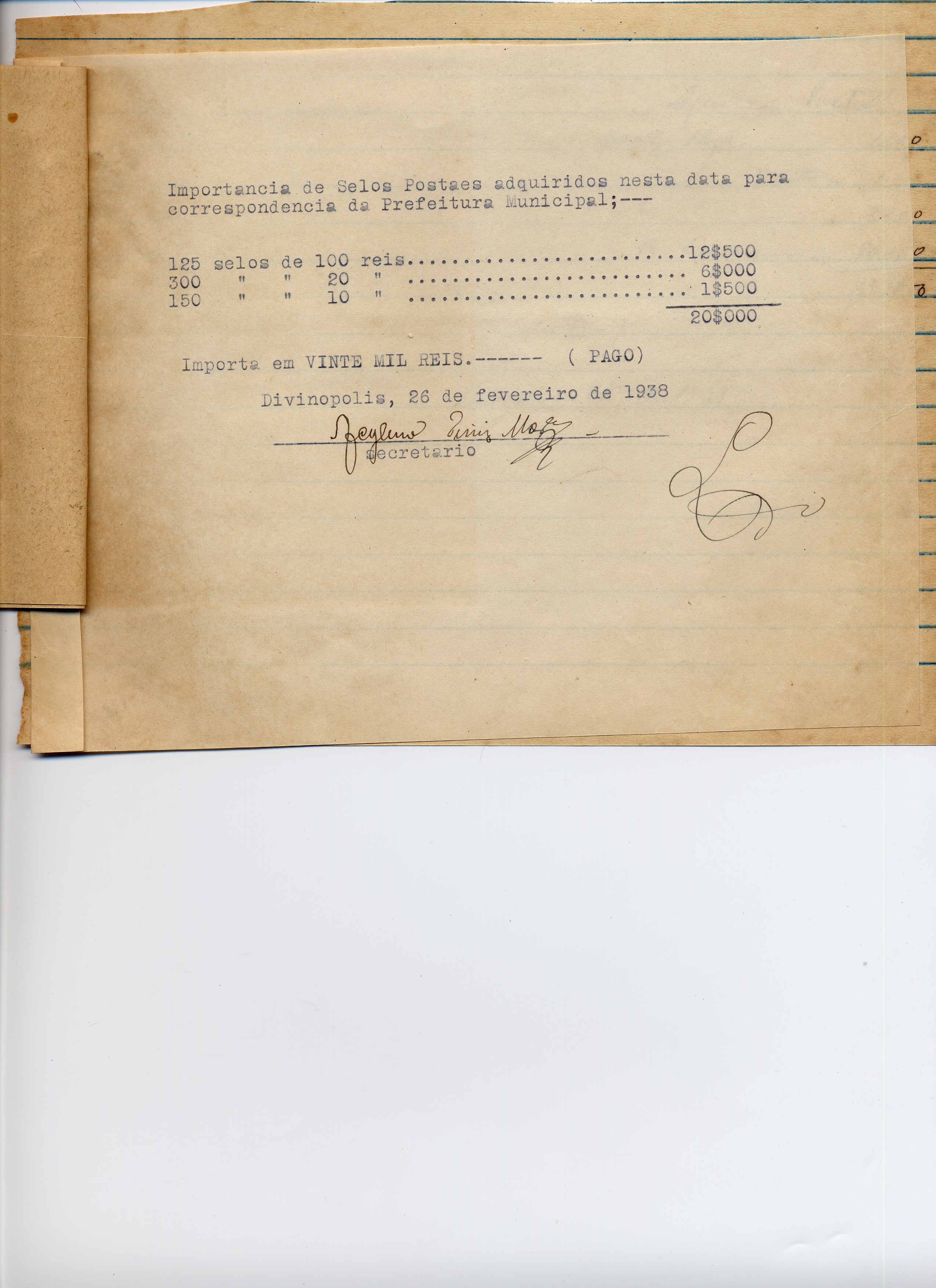PREFEITURA MUNICIPAL DE DIVINÓPOLIS PORTARIA N.º 73 PAGUE-SE AO SNR. AGÊNCIA POSTAL DE ACCORDO COM O DECRETO N.º 3 DE 08 DE JANEIRO DE 1938, PELA VERBA VI-I SERVIÇO POSTAL EM FEVEREIRO , A QUANTIA DE 23$400 (VINTE E TRÊS MIL E QUATROCENTOS RÉIS) PREFEITO: ANTONIO GONÇALVES DE MATOS OBS: RECIBO DE PAGAMENTO PROVENIENTE DESPESAS COM SERVIÇOS TELEGRÁFICOS.