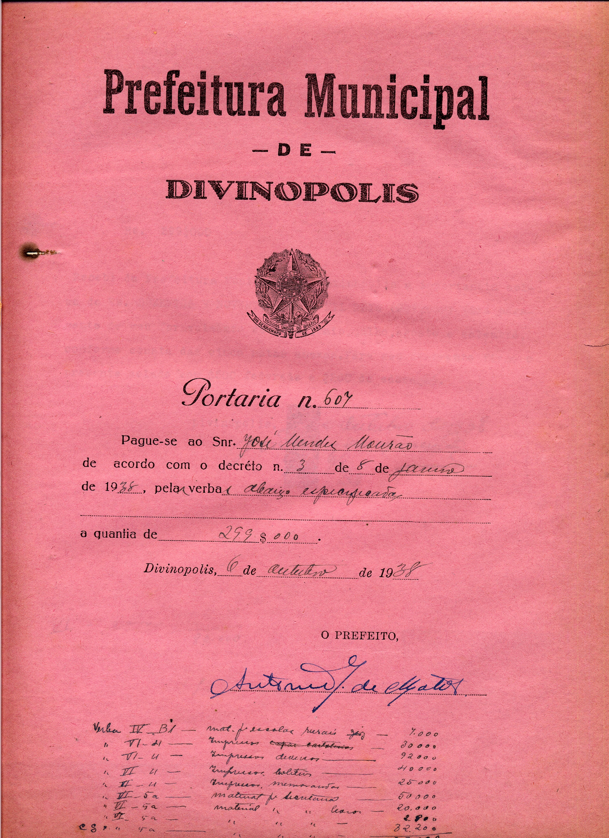 PAGUE-SE AO SNR JOSÉ MENDES MOURÃO DE ACORDO COM O DECRETO Nº 3 DE 08 DE JANEIRO DE 1938, PELAS VERBAS ABAIXO ESPECIFICADAS A QUANTIA DE 299$000 (DUZENTOS E NOVENTA E NOVE MIL RÉIS)