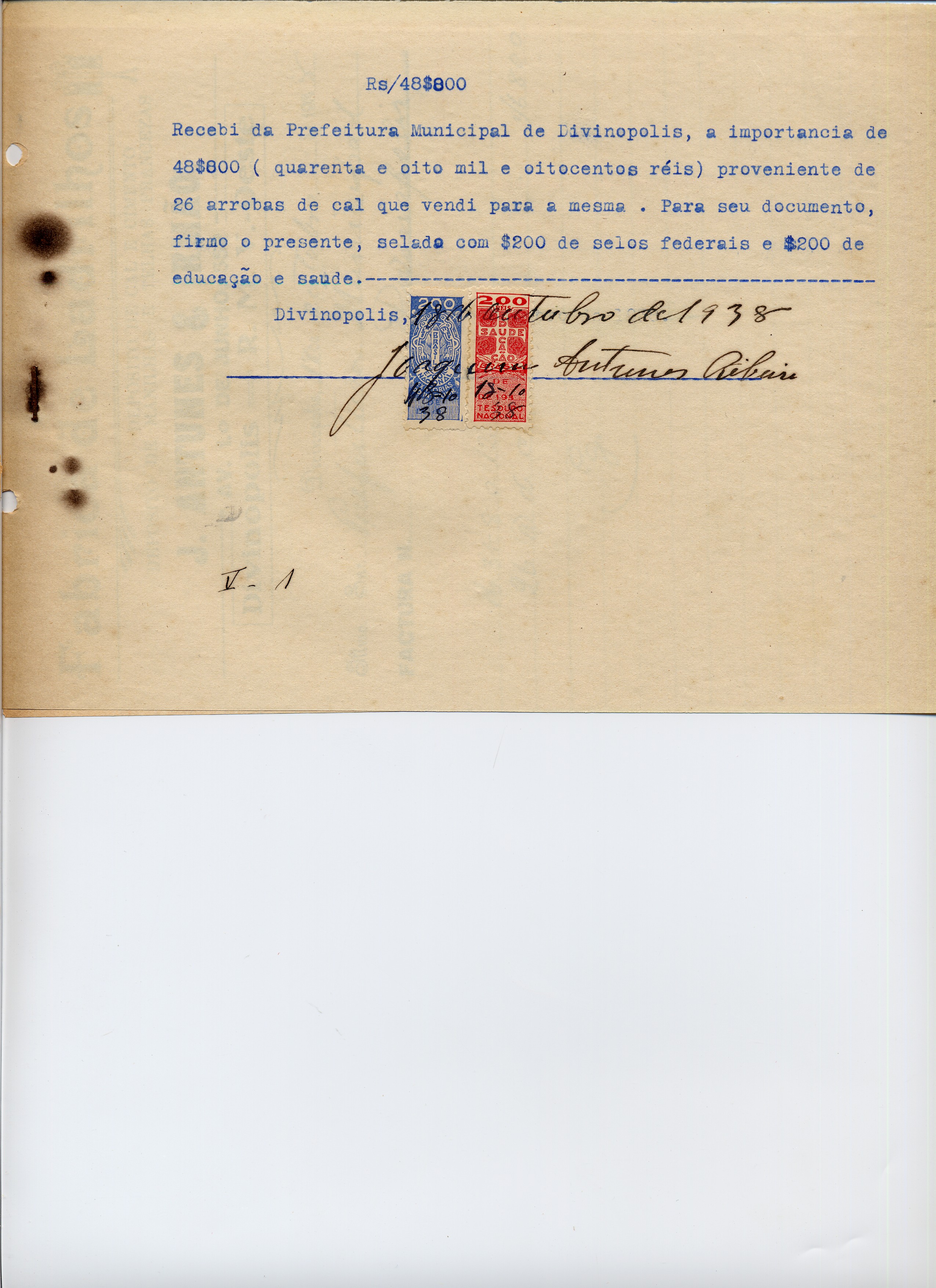 PAGUE-SE AO SNR JOAQUIM ANTUNES RIBEIRO DE ACORDO COM O DECRETO Nº 3 DE 08 DE JANEIRO DE 1938, PELA VERBA VI -26@ DE CAL P/ O MEIO FIO A QUANTIA DE 48$800 (QUARENTA E OITO MIL E OITOCENTOS RÉIS)
