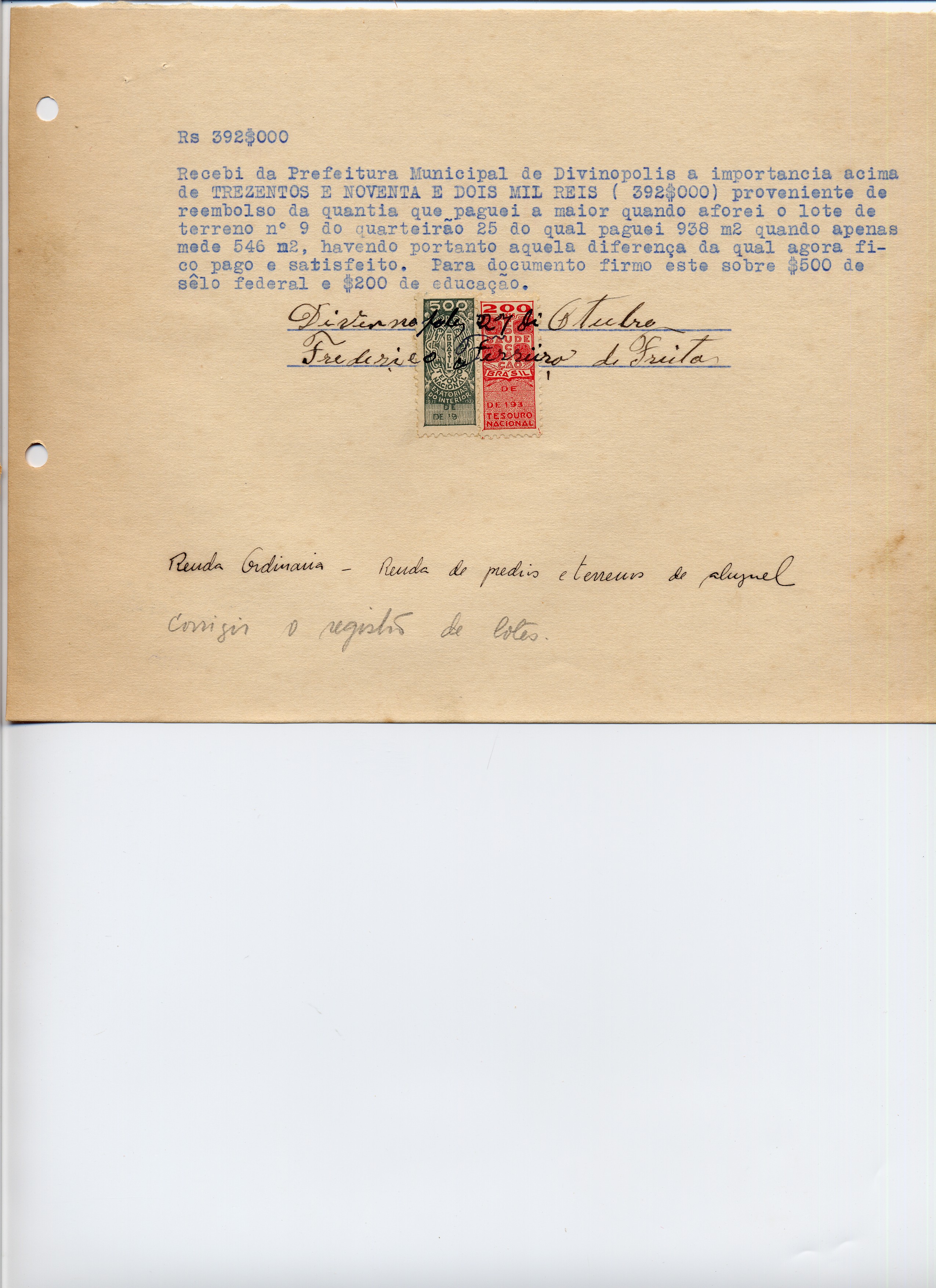 PAGUE-SE AO SNR FREDERICO FERREIRA DE FREITAS DE ACORDO COM O DECRETO Nº__ DE__ DE____DE 19__(SIC), PELA VERBA R- ORDINÁRIA - RENDA DE PRÉDIO E TERRENO DE ALUGUEL, DEVOLUÇÃO DE IMPORTÂNCIA COBRADA A MAIOR QUANDO AFOREI O LOTE DE TERRENO Nº 09 DO QUARTEIRÃO 25, A QUANTIA DE 392$000 (TRTEZENTOS E NOVENTA E DOIS MIL RÉIS)