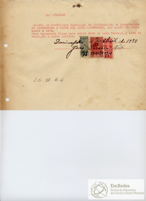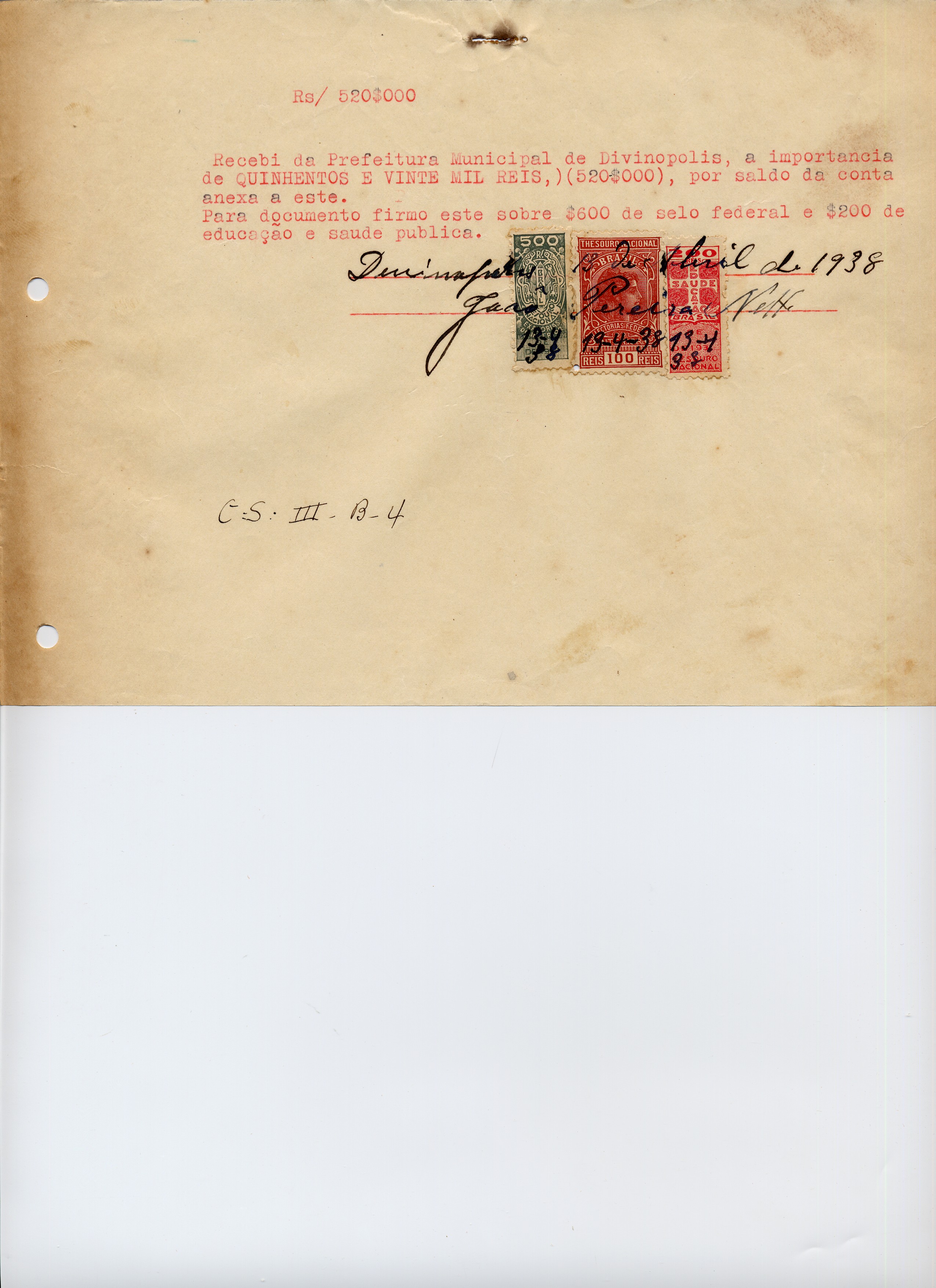 PAGUE-SE AO SNR JOÃO PEREIRA NETO DE ACORDO COM O DECRETO Nº 3 DE 08 DE JANEIRO DE 1938, PELA VERBA C- S III - B- 4 MADEIRA P/ PONTES E MATA- BURROS A QUANTIA DE 520$000 (QUINHENTOS E VINTE MIL RÉIS)