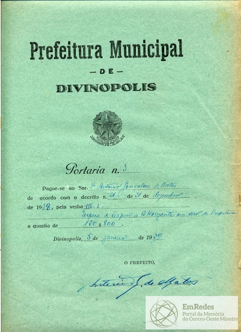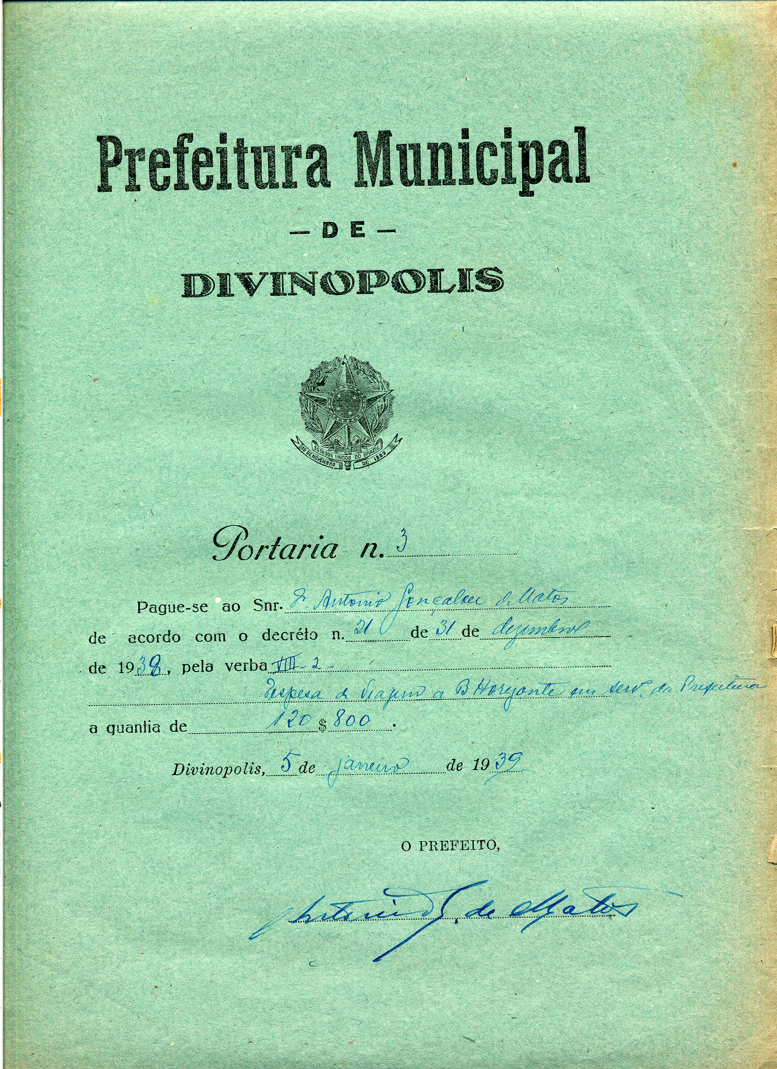 PAGUE-SE AO SNR ANTONIO GONÇALVES DE MATOS DE ACORDO COM O DECRETO Nº 21 DE 31 DE DEZEMBRO DE 1938, PELA VERBA VIII -2 DESPESA DE VIAGEM A BELO HORIZONTE EM SERVIÇO DA PREFEITURA, A QUANTIA DE 120$800 (CENTO E VINTE MIL E OITOCENTOS RÉIS)