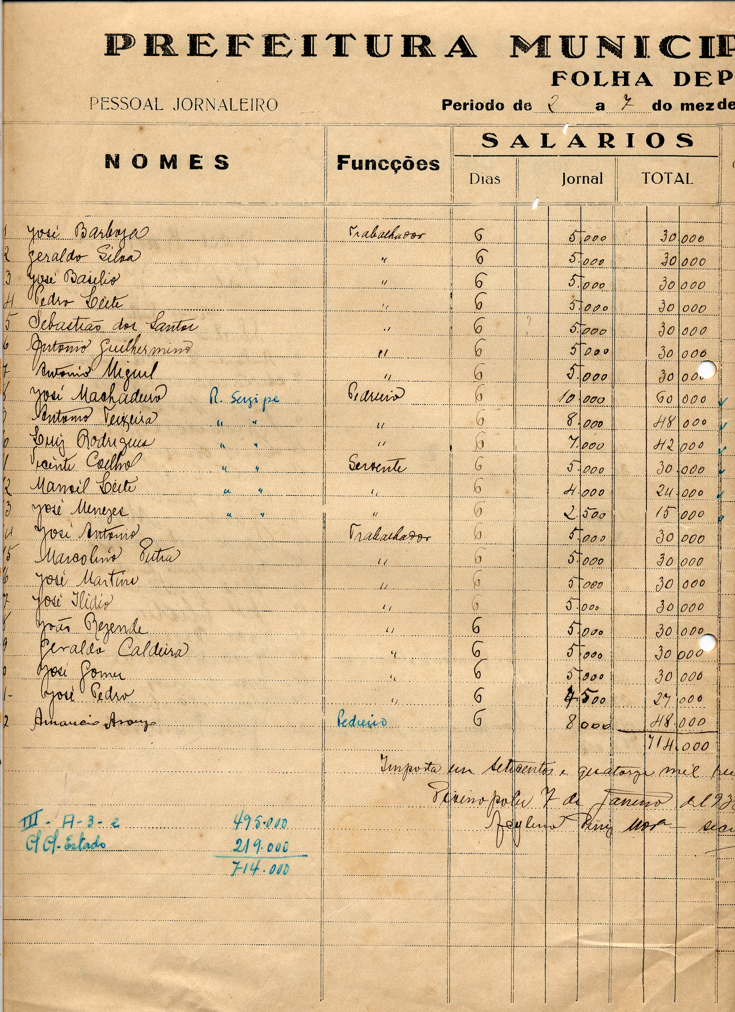 PAGUE-SE AO SNR PESSOAL OPERÁRIO DE ACORDO COM O DECRETO Nº 21 DE 31 DE 10BRO(SIC) DE 1938, PELAS VERBAS ABAIXO DESCRIMINADAS(SIC) A QUANTIA DE 714$000 (SETECENTOS E QUATORZE MIL RÉIS)