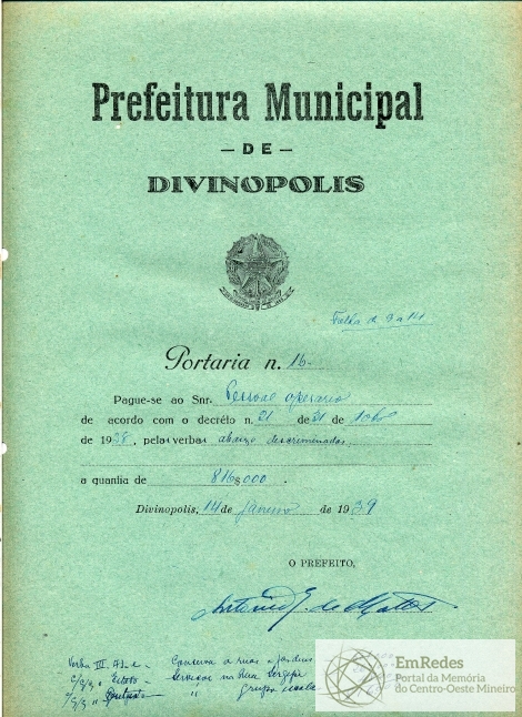 PAGUE-SE AO SNR PESSOAL OPERÁRIO DE ACORDO COM O DECRETO Nº 21 DE 31 DE 10BRO(SIC) DE 1938, PELAS VERBAS ABAIXO DESCRIMINADAS(SIC) A QUANTIA DE 816$000 (OITOCENTOS E DEZESSEIS MIL RÉIS)