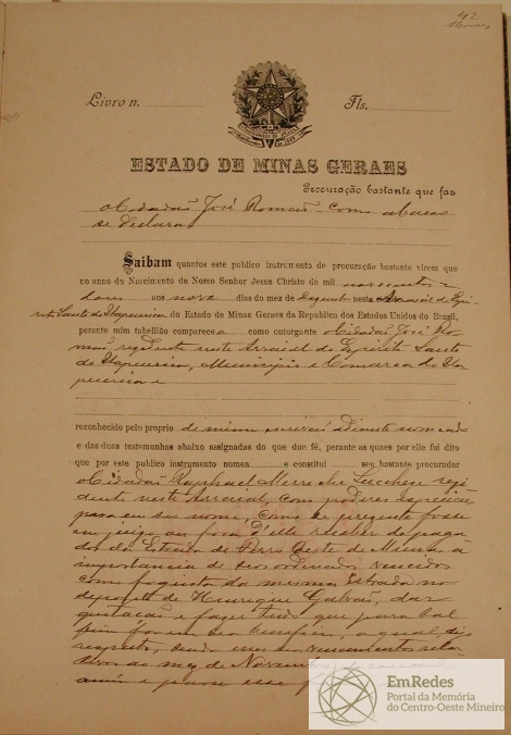 PROCURAÇÃO BASTANTE QUE FAZ JOSÉ ROMÃO, CONSTITUI SEU BASTANTE PROCURADOR RAPHAEL MERRICHE LUCHEZI RESIDENTE NESTE ARRAIAL COM PODERES PARA RECEBER DO PAGADOR DA ESTRADA DE FERRO OESTE DE MINAS SEUS ORDENADOS VENCIDOS COMO FOGUISTA DA MESMA ESTRADA NO DEPÓSITO DE HENRIQUE GALVÃO RELATIVO AO MÊS DE NOVEMBRO DE 1902.