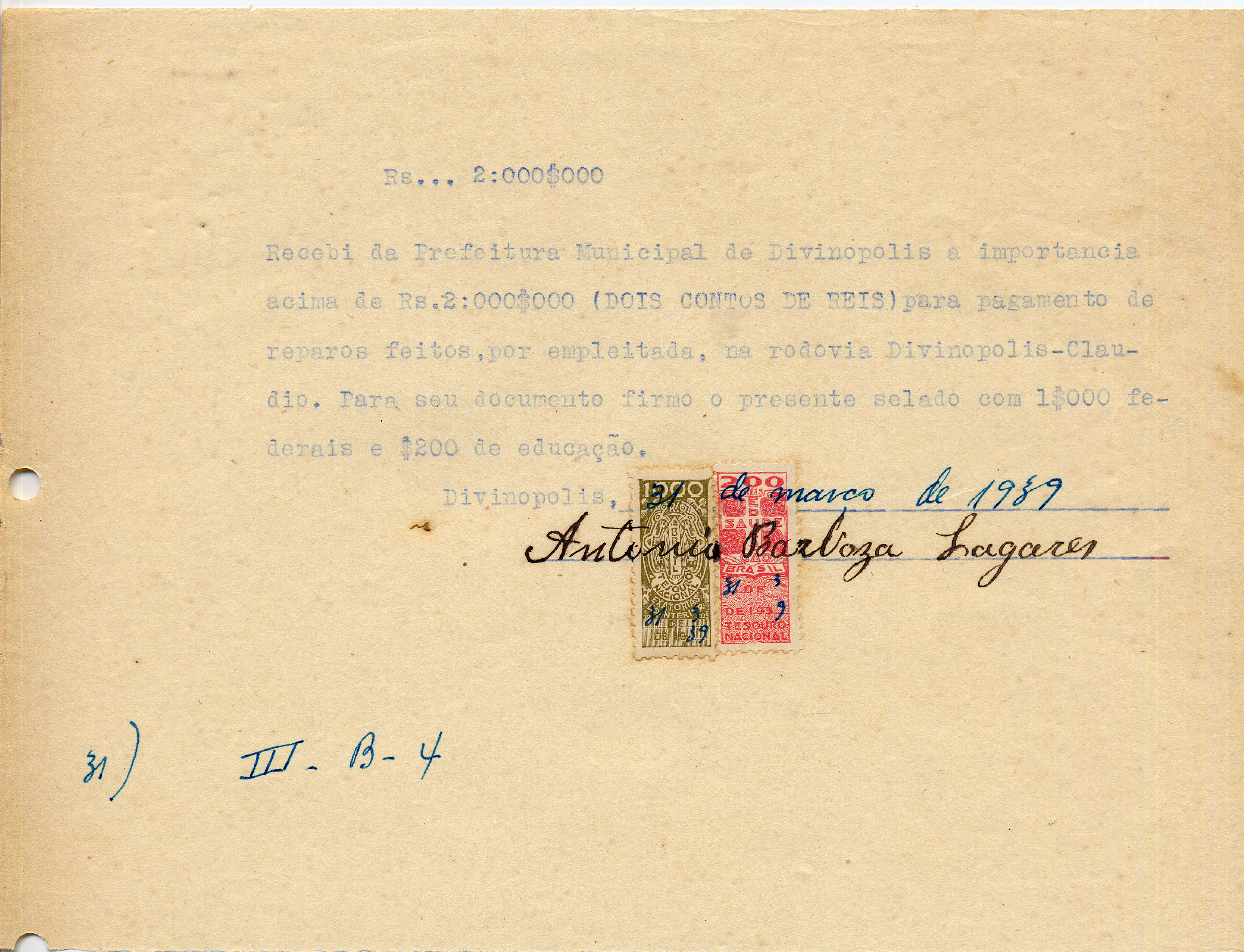 PAGUE-SE AO SNR ANTONIO BARBOSA LAGARES DE ACORDO COM O DECRETO Nº 21 DE 31 DE XII DE 1939(SIC), PELA VERBA III - B- 4 - REPAROS NA RODOVIA DIVINÓPOLIS - CLÁUDIO A QUANTIA DE 2.000$000 (DOIS CONTOS DE RÉIS)