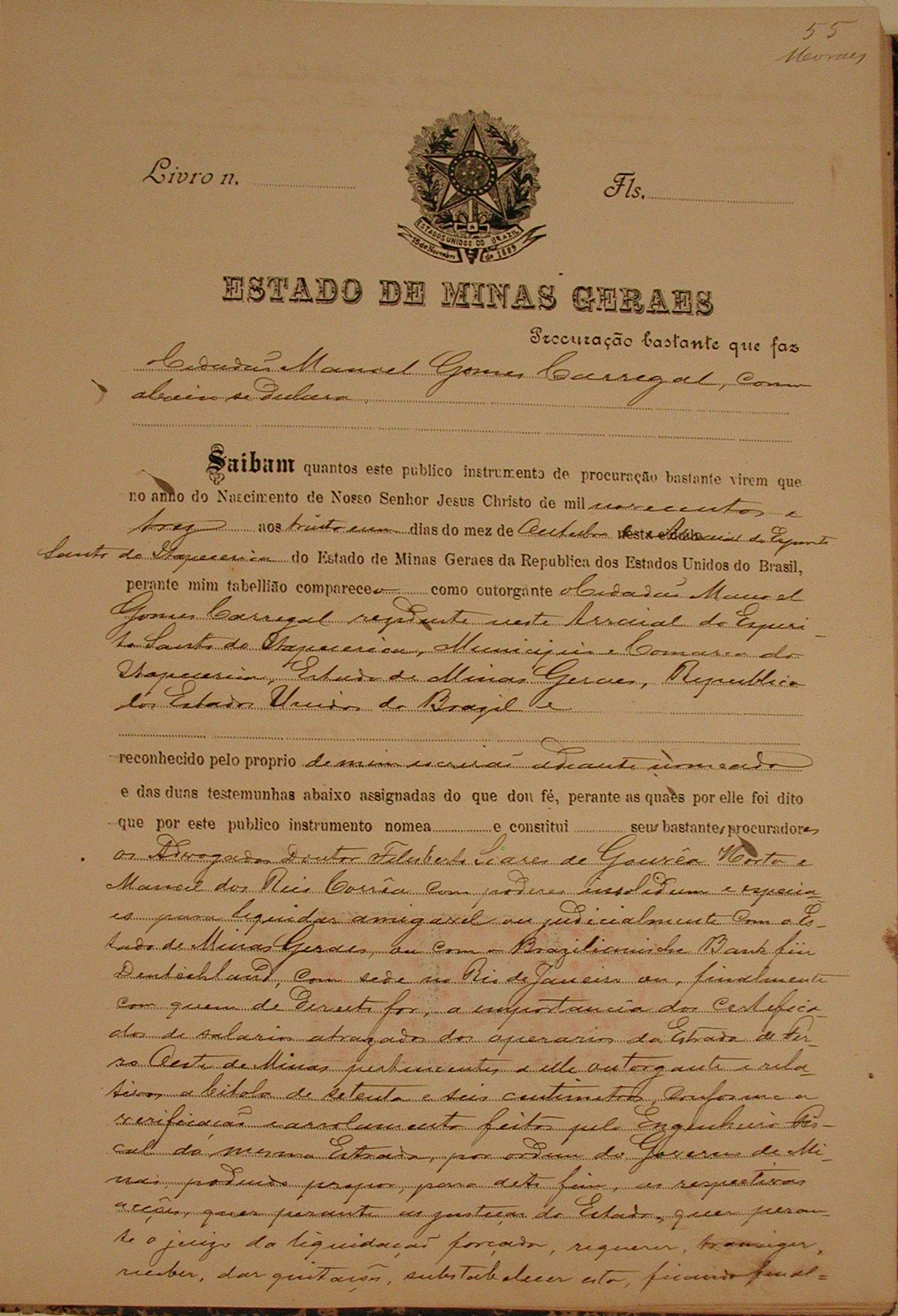 PROCURAÇÃO BASTANTE QUE FAZ MANOEL GOMES CARREGAL, CONSTITUI SEUS BASTANTES PROCURADORES OS ADVOGADOS DR. FELISBERTO SOARES DE GOUVEA HORTA E DR. MANOEL DOS REIS CORRÊA COM PODERES PARA LIQUIDAR AMIGAVELMENTE OU JUDICIALMENTE COM O ESTADO DE MINAS OU COM O BRAZILIANISCHE BANK FUR DEUSTCHLAND, COM SEDE NO RIO DE JANEIRO A IMPORTÂNCIA DOS CERTIFICADOS DE SALÁRIOS ATRASADOS DOS OPERÁRIOS DA ESTRADA DE FERRO OESTE DE MINAS PERTENCENTES A ELES OUTORGANTES.