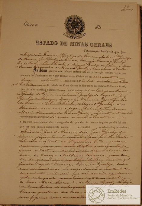 PROCURAÇÃO BASTANTE QUE FAZEM FRANCISCO GONTIJO DA FOSENCA, ANTONIO GONTIJO DA FONSECA, JOSÉ GONTIJO DA FONSECA, DOMINGOS FRANCISCO GONTIJO, PIO DA FONSECA E SILVA SOBRINHO, MIGUEL GONTIJO DA FONSECA E DONA MARIA FERNANDES DA FONSECA GONTIJO CONSTITUIEM SEUS BASTANTES PROCURADORES JOÃO GONTIJO DA FONSECA RESIDENTE NESTE DISTRITO E JOÃO JOSÉ DOS SANTOS SOBRINHO RESIDENTE EM ITAPECERICA COM PODERES PARA REQUERER A CARTA DE ARREMATAÇÃO DAS TERRAS DE CAMPOS E CULTURAS SEPARADAS PARA CUSTAS DO INVENTÁRIO E PARTILHAS DOS BENS DEIXADOS PELO FINADO CAPITÃO DOMINGOS FRANCISCO GONTIJO, SENDO ESSA ARREMATAÇÃO NA IMPORTÂNCIA DE 1 CONTO 180 MIL RÉIS QUE SERÁ DIVIDIDA IGUALMENTE PELOS OUTORGANTES.
