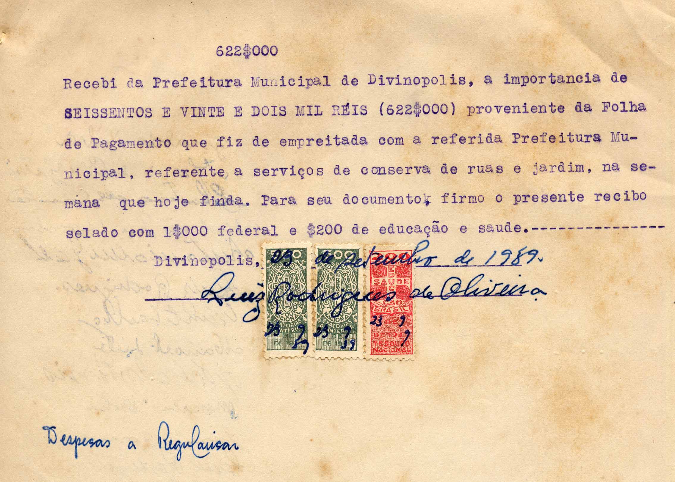 PAGUE-SE AO SNR LUIZ RODRIGUES DE OLIVEIRA DE ACORDO COM O DECRETO Nº __DE __DE ___ DE 19__(SIC), PELA VERBA DESPESAS A REGULARISAR(SIC) SERVIÇO DE EMPREITADA C/ O PESSOAL CONSERVA DE RUAS A QUANTIA DE 622$000 (SEISCENTOS E VINTE E DOIS MIL RÉIS)