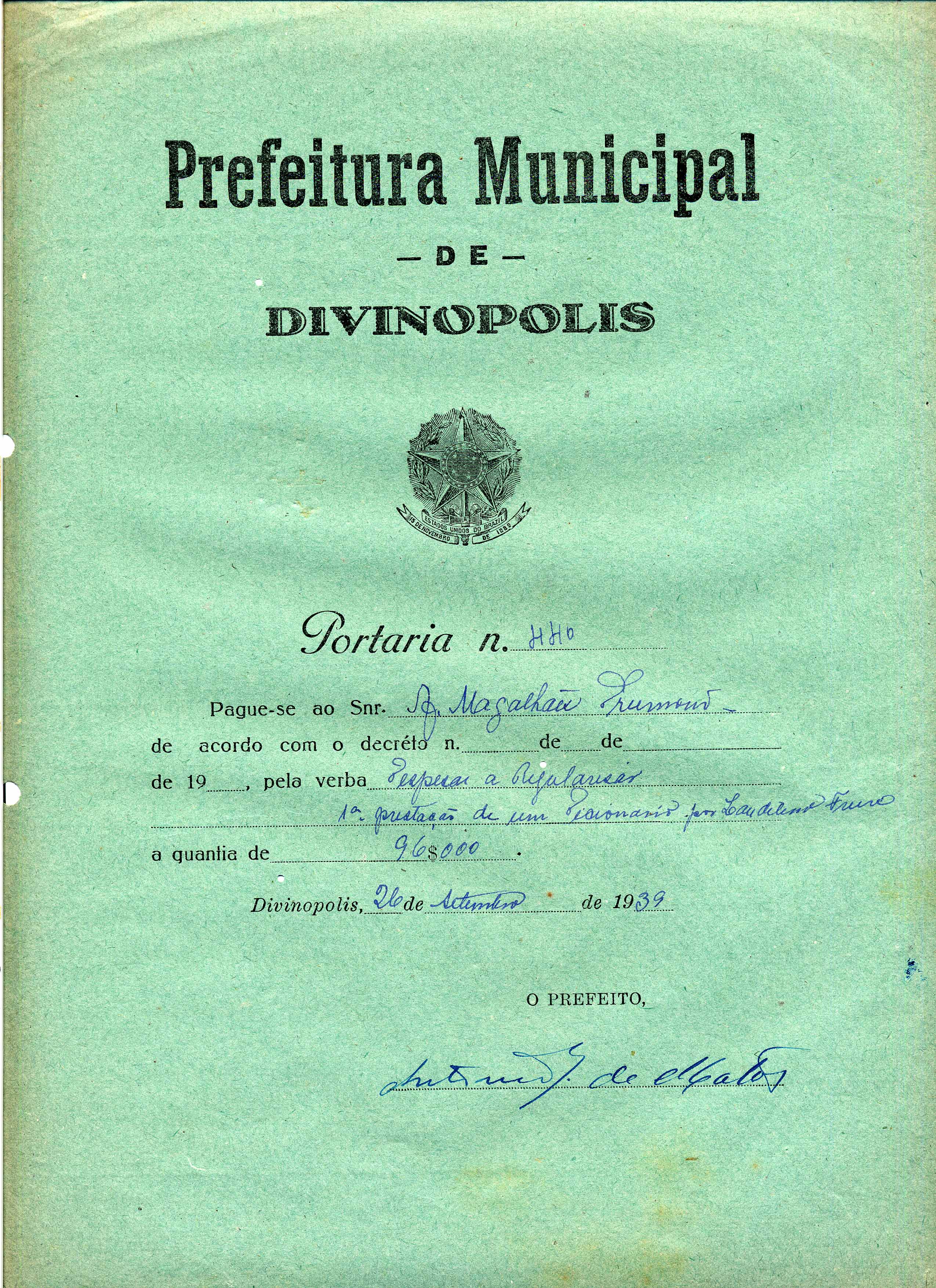 PAGUE-SE AO SNR A. MAGALHÃES DRUMOND DE ACORDO COM O DECRETO Nº DE DE DE 19(SIC), PELA VERBA DESPESAS A REGULARISAR(SIC) - 1ª PRESTAÇÃO DE UM DICIONÁRIO POR LAUDELINO FREIRE A QUANTIA DE 96$000 (NOVENTA E SEIS MIL RÉIS)