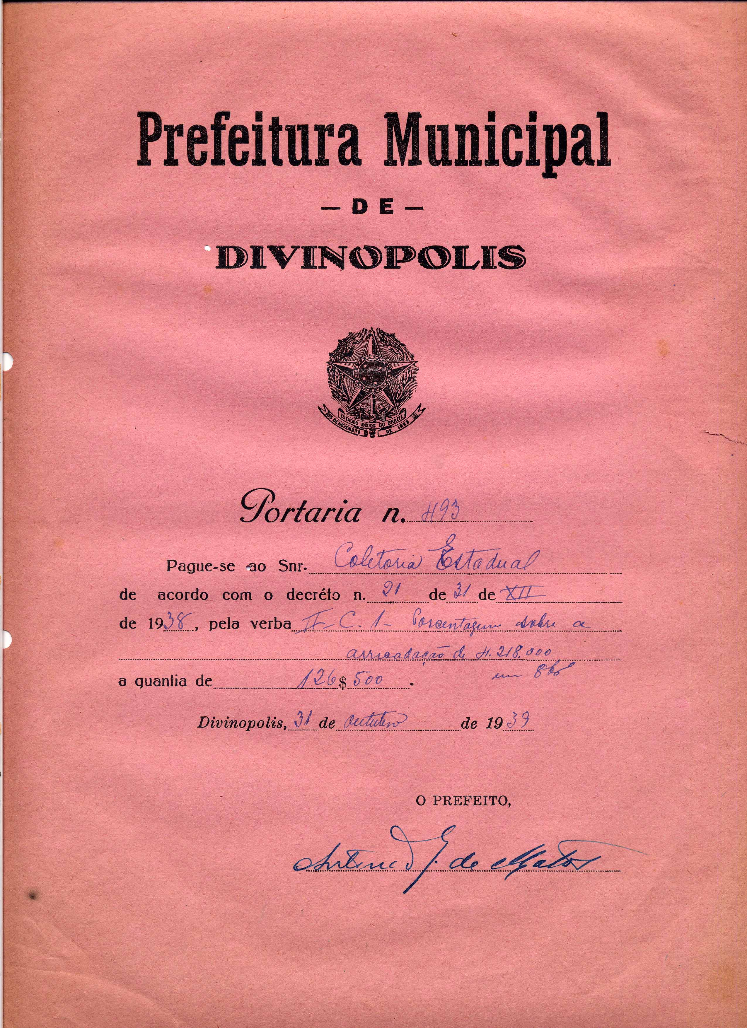 PAGUE-SE AO SNR COLETORIA ESTADUAL DE ACORDO COM O DECRETO Nº 21 DE 31 DE XII DE 1938, PELA VERBA II - C- 1 PORCENTAGEM SOBRE ARRECADAÇÃO DE 4.218$000 A QUANTIA DE 126$500 (CENTO E VINTE E SEIS MIL E QUINHENTOS RÉIS)
