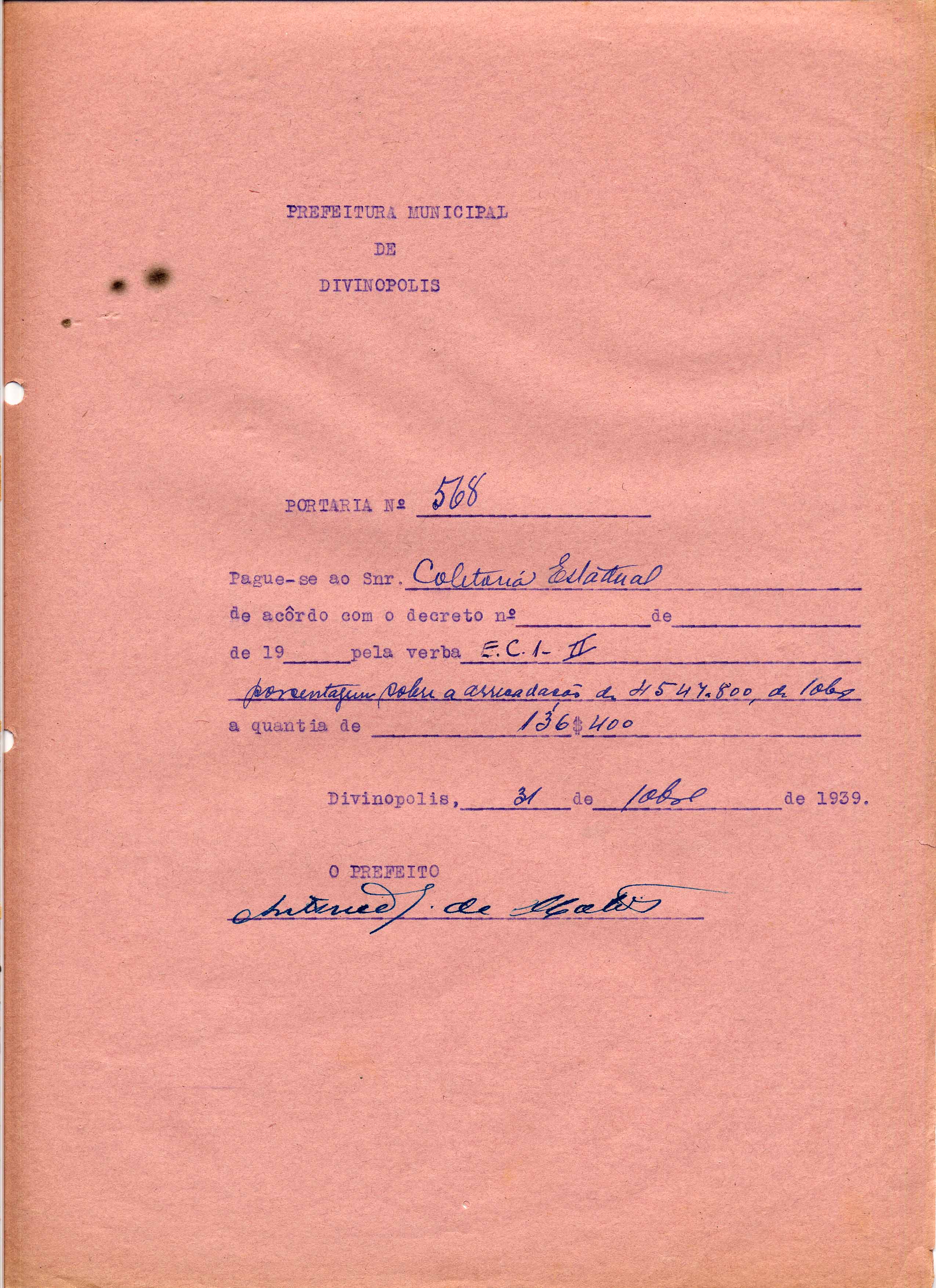 PAGUE-SE AO SNR COLETORIA ESTADUAL DE ACORDO COM O DECRETO Nº (SIC), PELA VERBA E.C. 1 II - PORCENTAGEM SOBRE A ARRECADAÇÃO DE 4.547$800 DE DEZEMBRO A QUANTIA DE 136$400 (CENTO E TRINTA E SEIS MIL E QUATROCENTOS RÉIS)