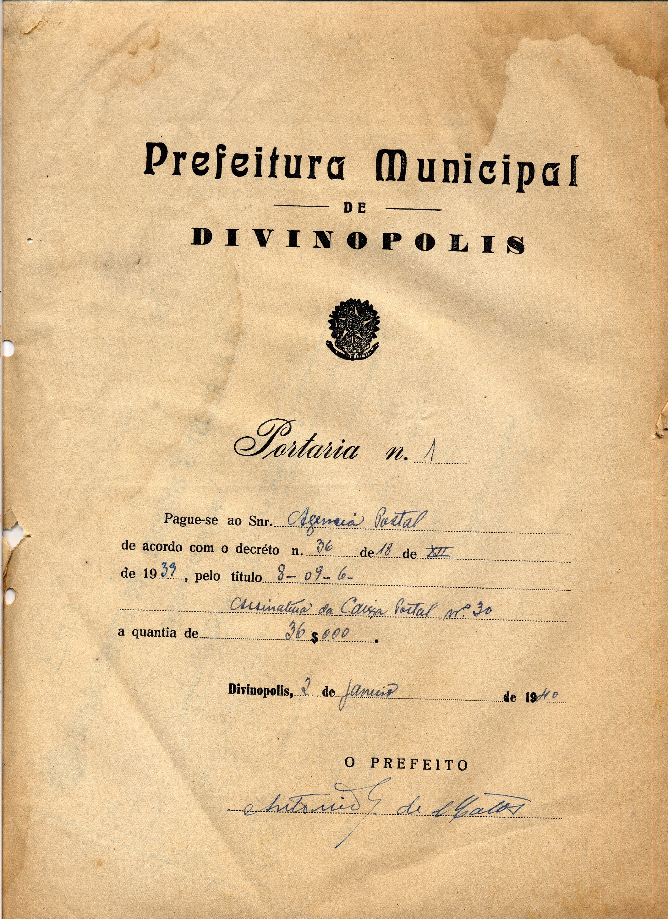 PAGUE-SE AO SNR AGÊNCIA POSTAL DE ACORDO COM O DECRETO Nº 36 DE 18 DE XII DE 1939, PELO TÍTULO 08-09-06, ASSINATURA DA CAIXA POSTAL Nº 30 A QUANTIA DE 36$000 (TRINTA E SEIS MIL RÉIS)