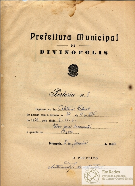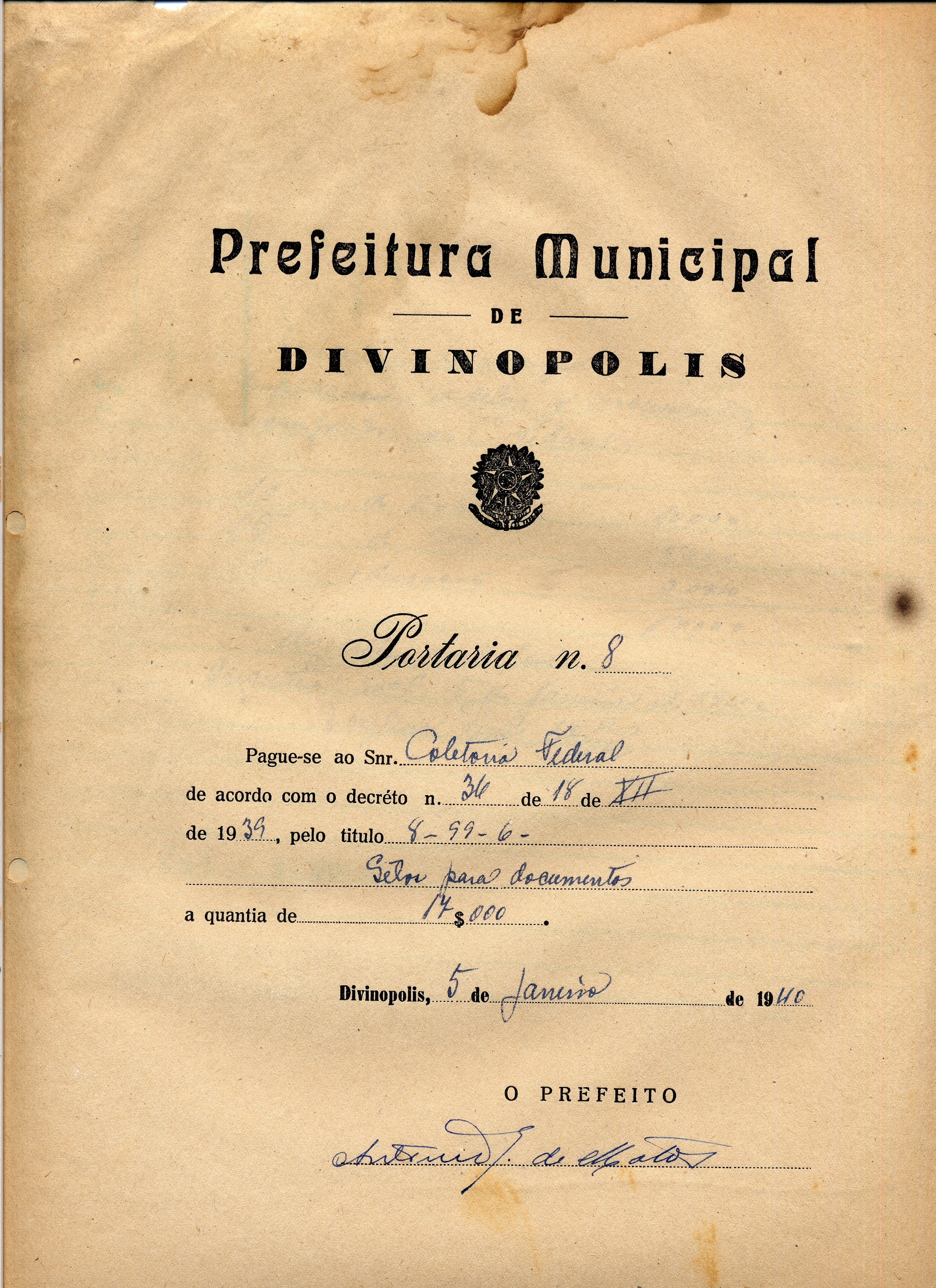 PREFEITURA MUNICIPAL DE DIVINÓPOLIS PORTARIA Nº 008 PAGUE-SE AO SNR COLETORIA FEDERAL DE ACORDO COM O DECRETO Nº 36 DE 18 DE XII DE 1939, PELO TÍTULO 8-99-6 SELOS PARA DOCUMENTOS A QUANTIA DE 17$000 (DEZESSETE MIL RÉIS) PREFEITO: ANTONIO GONÇALVES DE MATOS OBS: RECIBO DE PAGAMENTO PROVENIENTE SELOS PARA DOCUMENTOS COMPRADOS NA C. FEDERAL.