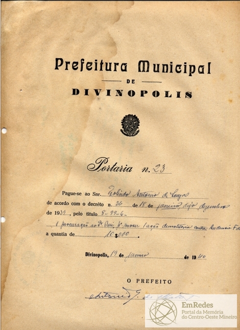 PAGUE-SE AO SNR DEOLINDO ANTONIO DE SOUSA, DE ACORDO COM O DECRETO Nº 36 DE 18 DE JANEIRO (DEZEMBRO DIGO) (SIC) DE 1939, PELO TÍTULO 8-99-6 (1 PROCURAÇÃO AO DR. RUI AMORIM, Pª MOVER UMA AÇÃO DEMOLITORIA CONTRA AUDIENCIA, A QUANTIA DE 10$000 (DEZ MIL RÉIS).