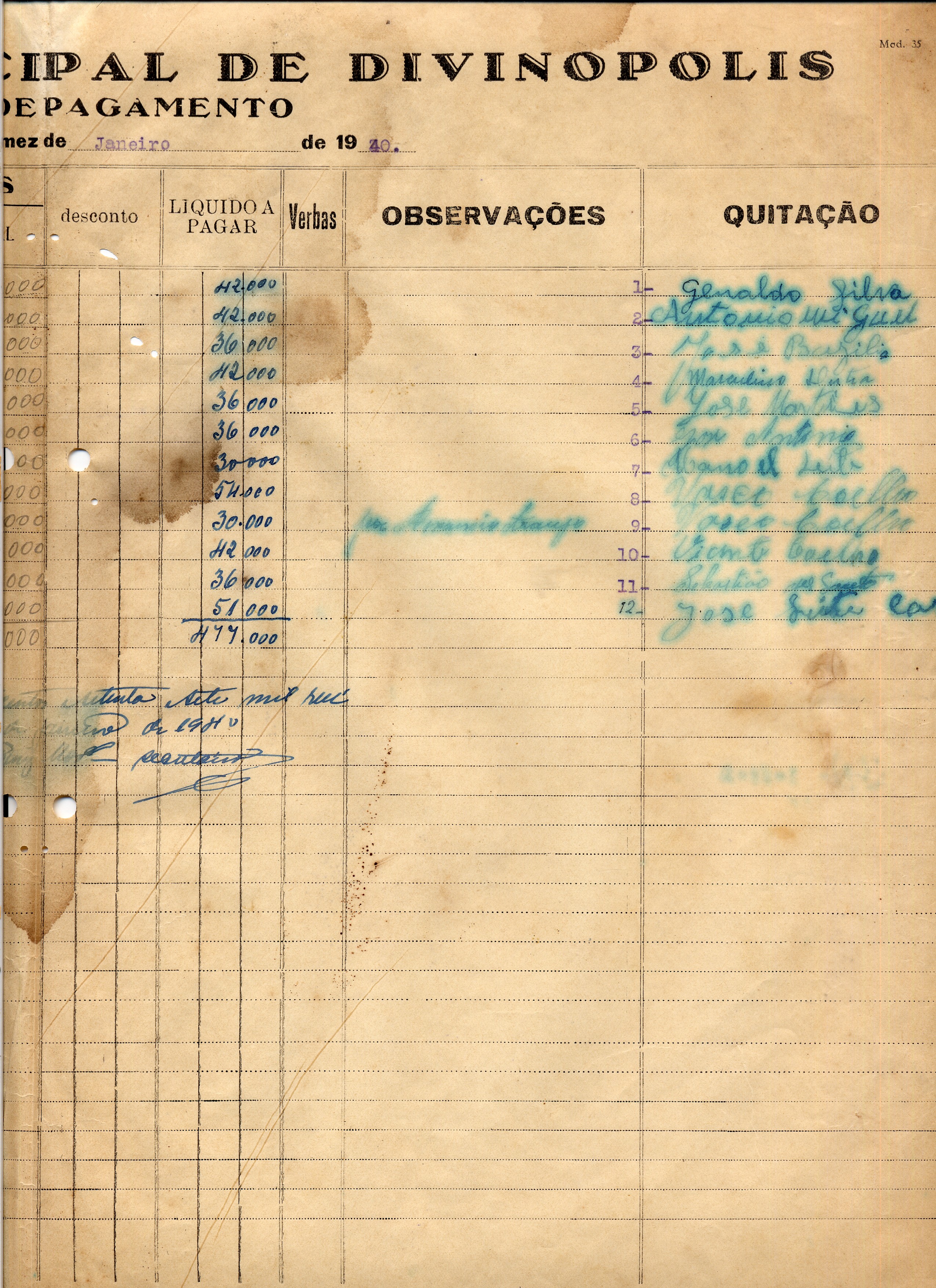 OBS.: RECIBO REFERENTE A FOLHA DE PAGAMENTO NO PERÍODO DE 14 A 20 DO MÊS DE JANEIRO DE 1940.