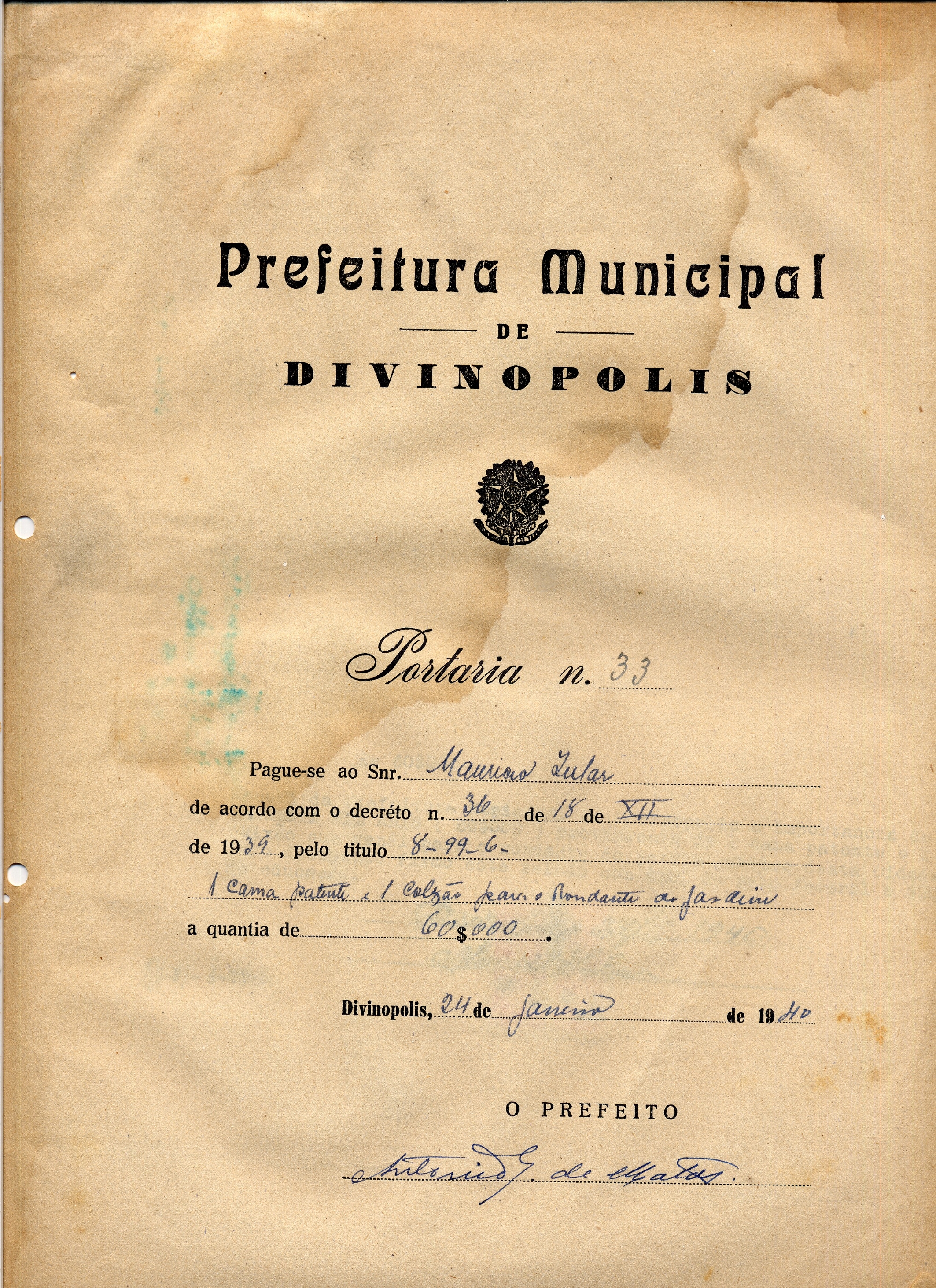 PAGUE-SE AO SNR MAURÍCIO ZULAR DE ACORDO COM O DECRETO Nº 36 DE 18 DE XII DE 1939, PELO TÍTULO 8-99-6 - 1CAMA PATENTE E 1 COLCHÃO PARA O RONDANTE DO JARDIM A QUANTIA DE 60$000 (SESSENTA MIL RÉIS)