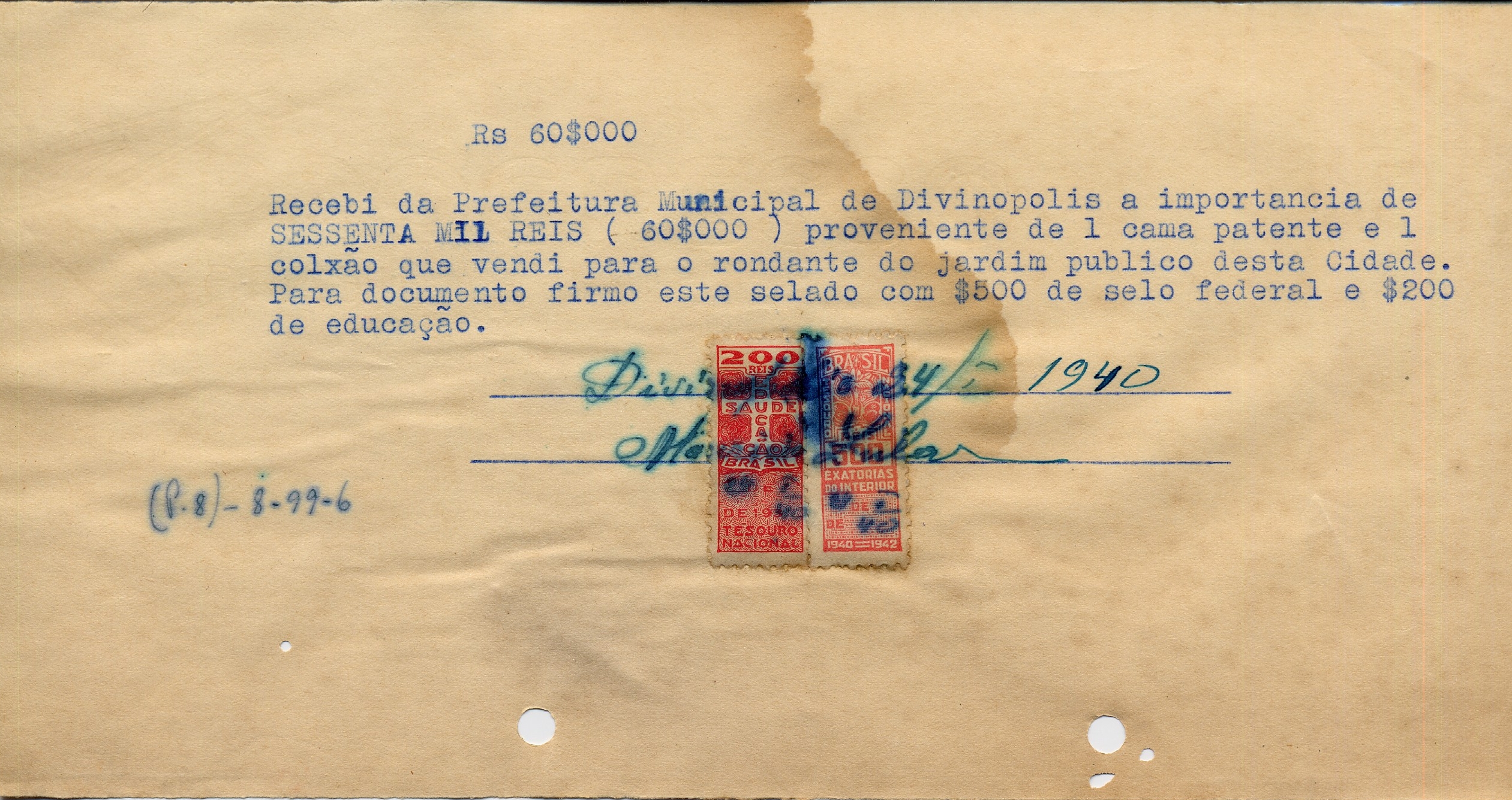 PAGUE-SE AO SNR MAURÍCIO ZULAR DE ACORDO COM O DECRETO Nº 36 DE 18 DE XII DE 1939, PELO TÍTULO 8-99-6 - 1CAMA PATENTE E 1 COLCHÃO PARA O RONDANTE DO JARDIM A QUANTIA DE 60$000 (SESSENTA MIL RÉIS)