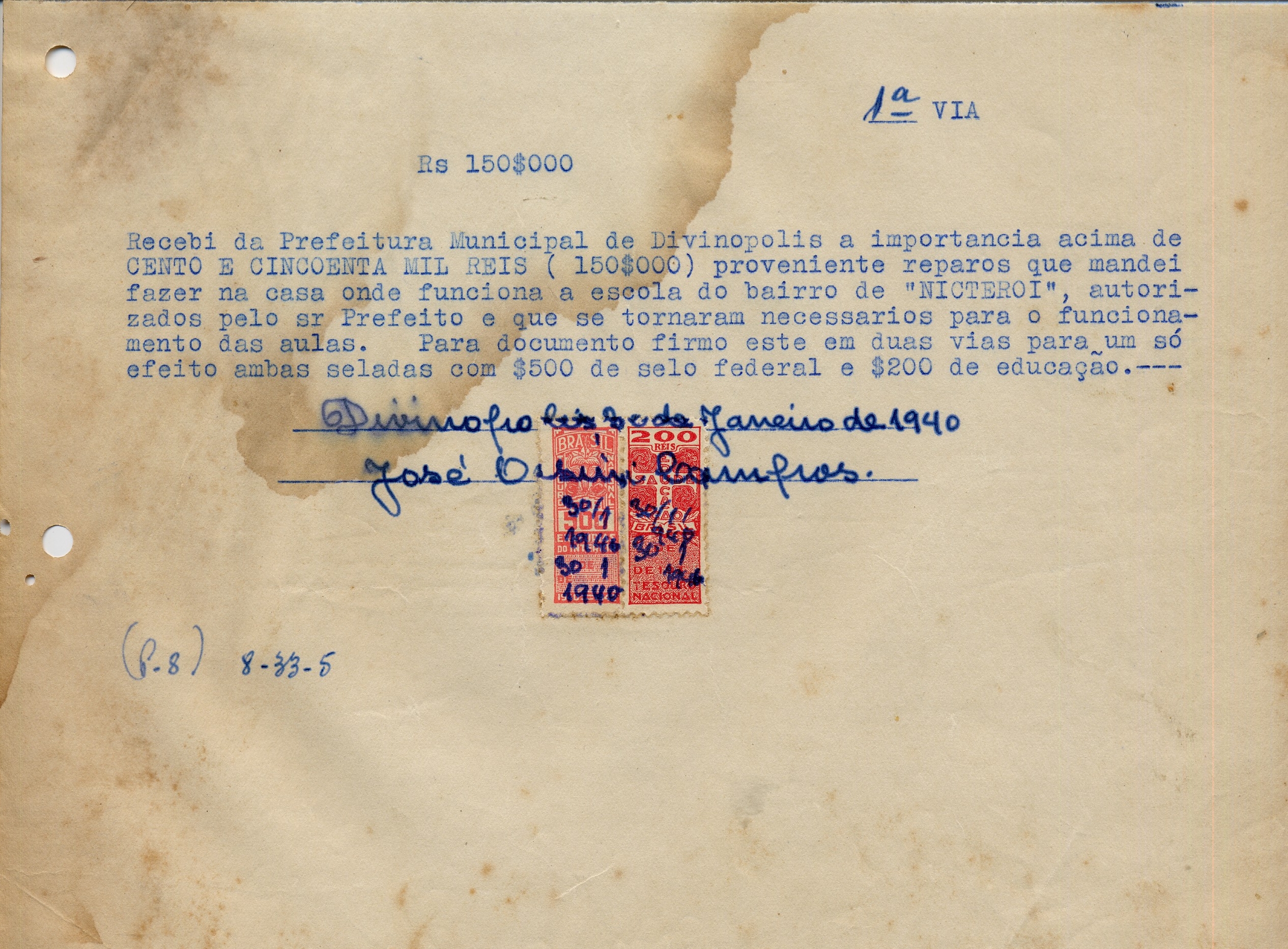 PREFEITURA MUNICIPAL DE DIVINÓPOLIS PORTARIA Nº 037 PAGUE-SE AO SNR JOSÉ ORSINI CAMPOS DE ACORDO COM O DECRETO Nº 36 DE 18 DE XII DE 1939, PELO TÍTULO 8-33-5- REPAROS NO PRÉDIO DA ESCOLA DE NITEROI A QUANTIA DE 150$000 (CENTO E CINQUENTA MIL RÉIS) PREFEITO: ANTONIO GONÇALVES DE MATOS OBS: RECIBO REFERENTE A REPAROS NA CASA DA ESCOLA DO NITEROI.