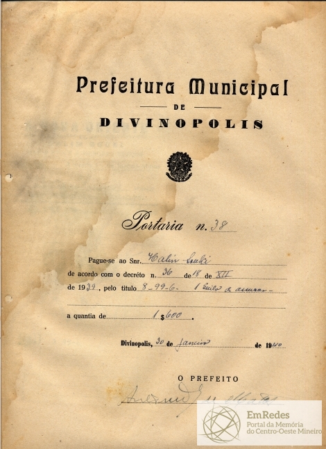 PAGUE-SE AO SNR HALIM SOUKI DE ACORDO COM O DECRETO Nº 36 DE 18 DE XII DE 1939, PELO TÍTULO 8-99-6 - 1 QUILO DE ASSUCAR(SIC) A QUANTIA DE 1$600 (HUM MIL E SEISCENTOS RÉIS)