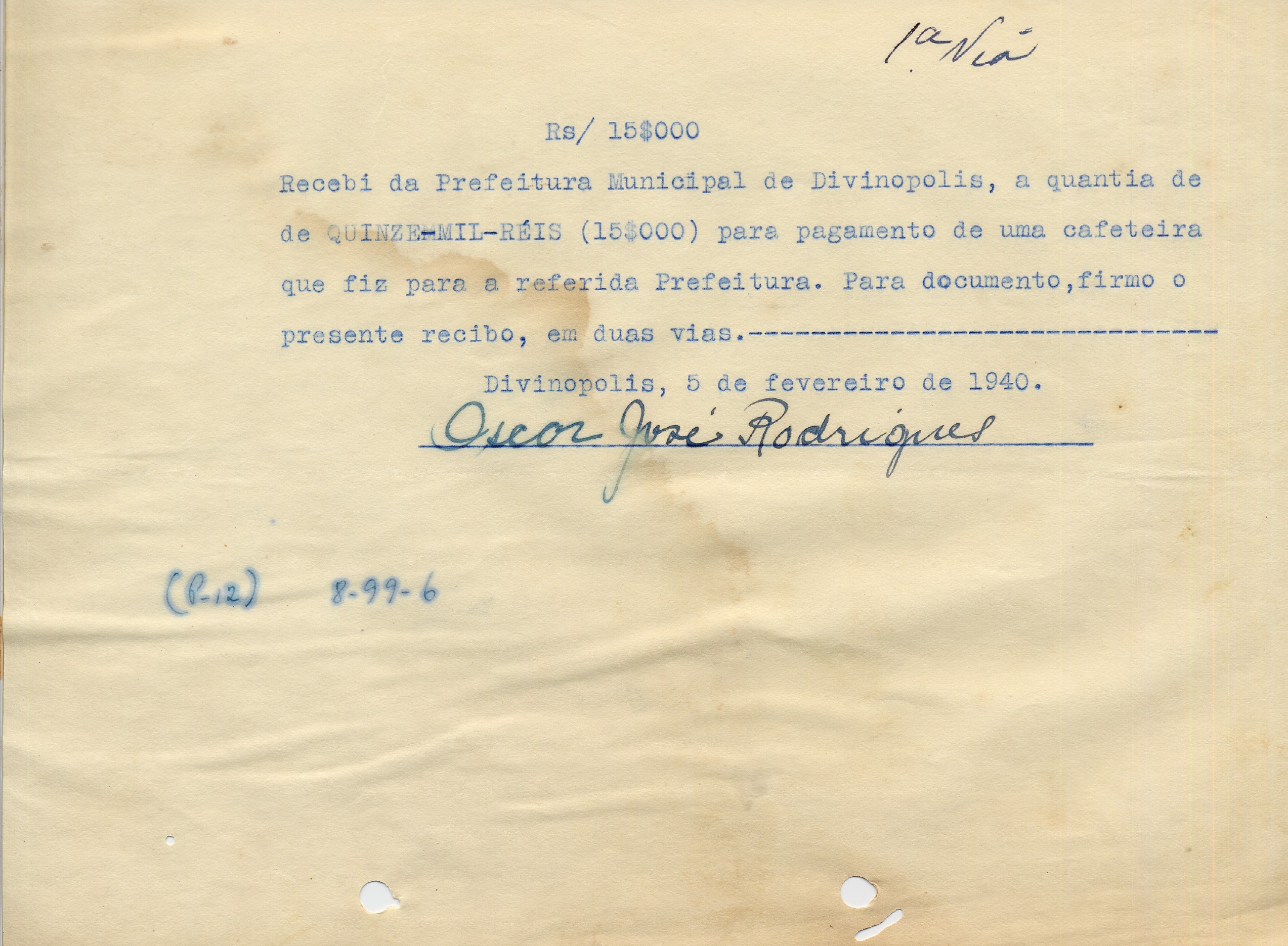 PAGUE-SE AO SNR OSCAR JOSÉ RODRIGUES DE ACORDO COM O DECRETO Nº 36 DE 18 DE XII DE 1939, PELO TÍTULO 8-99-6-