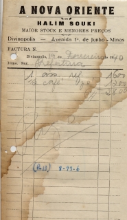 PAGUE-SE AO SNR HALIM SOUKI DE ACORDO COM O DECRETO Nº 36 DE 18 DE XII DE 1939, PELO TÍTULO 8-99-6- 1 QUILO DE ASSUCAR(SIC) E 1/2 DE CAFÉ A QUANTIA DE 2$800 (DOIS MIL E OITOCENTOS RÉIS)
