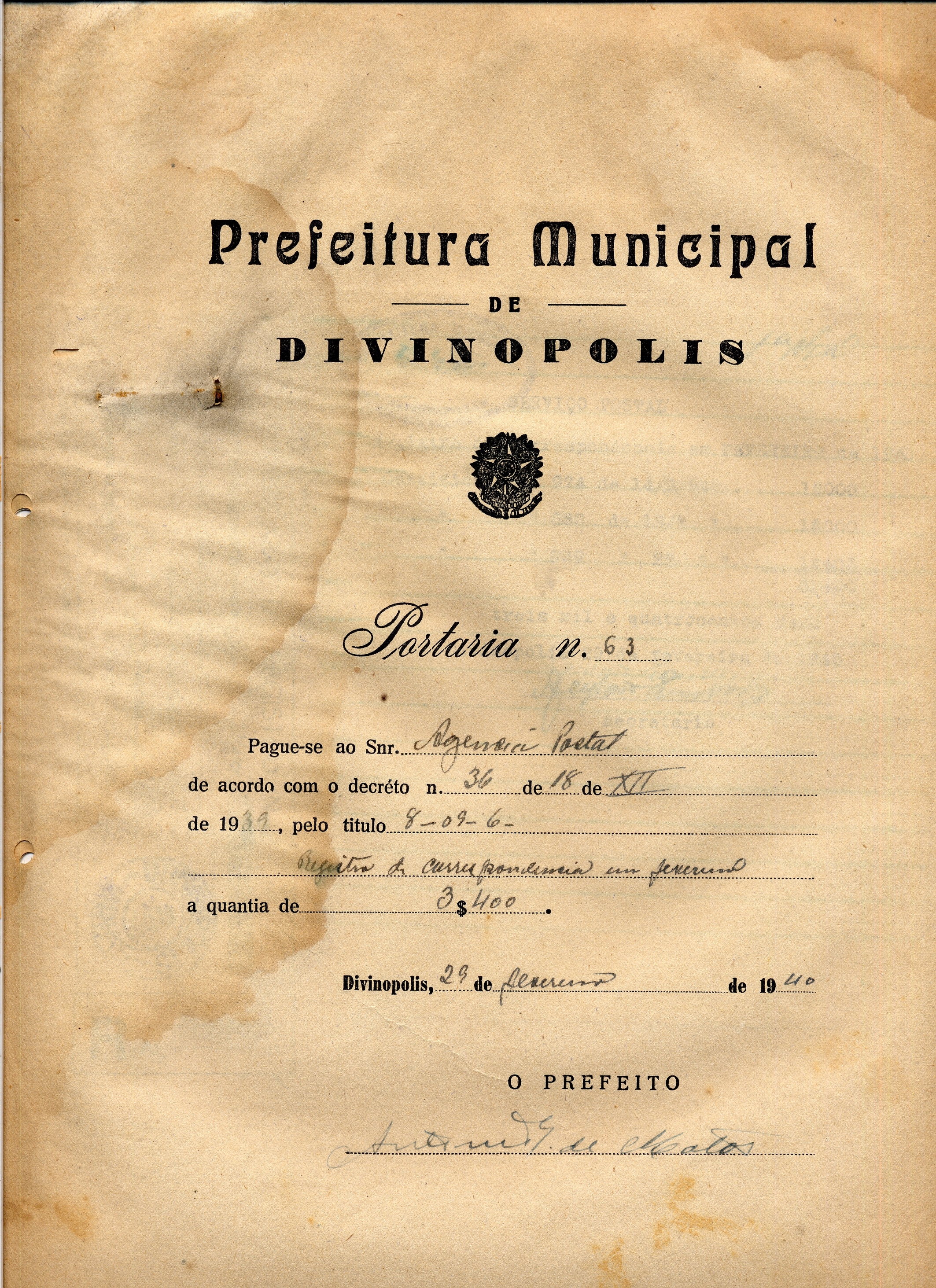 PAGUE-SE AO SNR AGÊNCIA POSTAL DE ACORDO COM O DECRETO Nº 36 DE 18 DE XII DE 1939, PELO TÍTULO 8-09-6 REGISTRO DE CORRESPONDÊNCIA EM FEVEREIRO, A QUANTIA DE 3$400 (TRÊS MIL E QUATROCENTOS RÉIS)