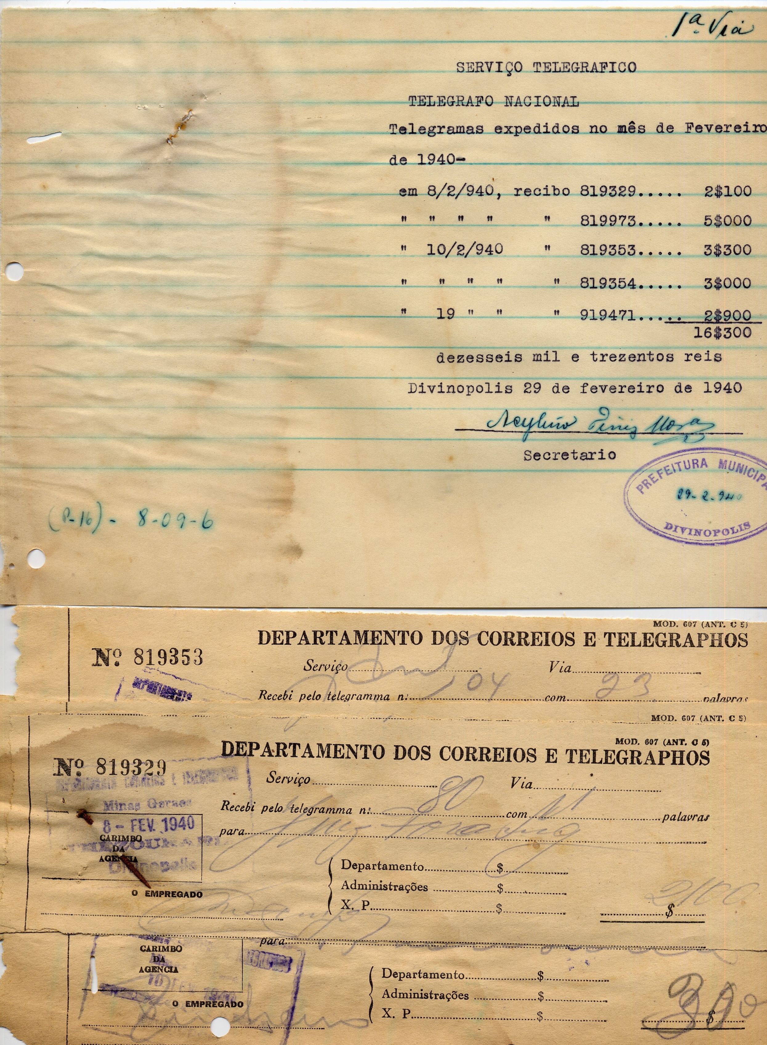 PAGUE-SE AO SNR TELÉGRAFO NACIONAL DE ACORDO COM O DECRETO Nº 36 DE 18 DE XII DE 1939, PELO TÍTULO 8-09-6- (TELEGRAMAS EXPEDIDOS DURANTE O MÊS) A QUANTIA DE 16$300 (DEZESSEIS MIL E TREZENTOS RÉIS)