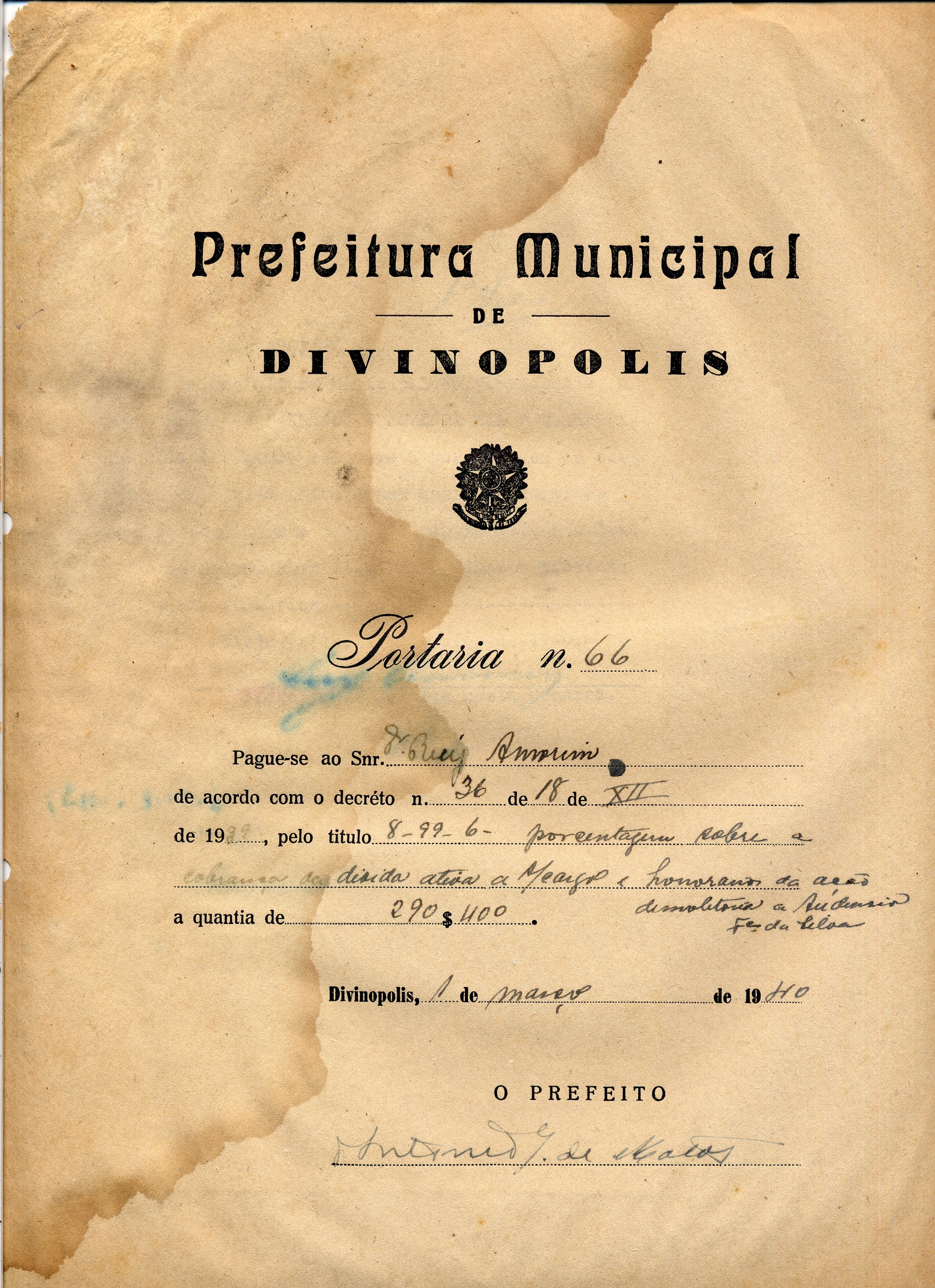 PAGUE-SE AO SNR RUY AMORIM DE ACORDO COM O DECRETO Nº 36 DE 18 DE XII DE 1939, PELO TÍTULO 8-99-6- PORCENTAGEM SOBRE A COBRANÇA DA DÍVIDA ATIVA A S/ CARGO E HONORÁRIOS DA AÇÃO DEMOLITORIA A AUDENSIO FRANCISCO DA SILVA A QUANTIA DE 290$400 (DUZENTOS E NOVENTA MIL E QUATROCENTOS RÉIS)