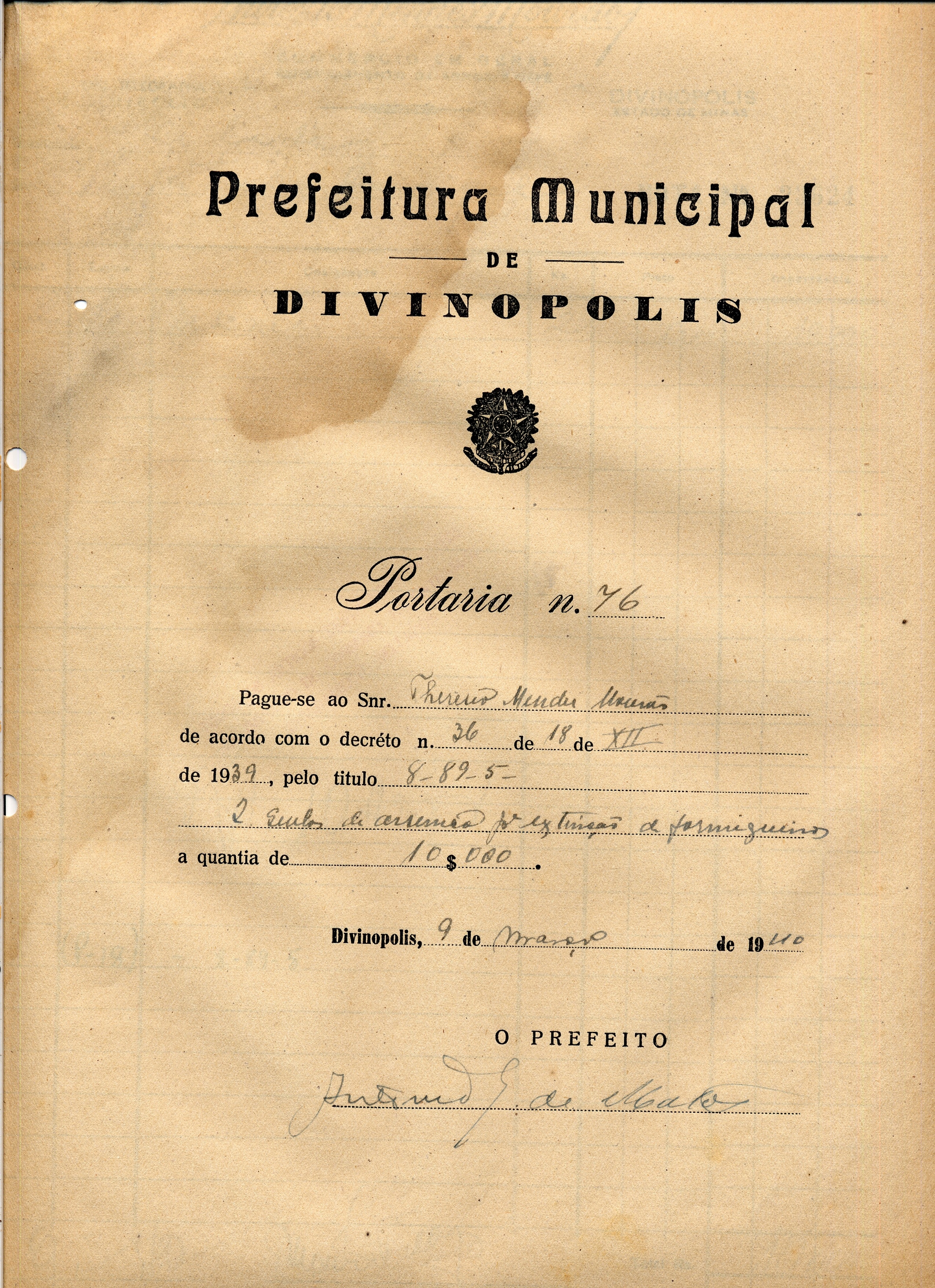 PAGUE-SE AO SNR THIRÉSIO MENDES MOURÃO DE ACORDO COM O DECRETO Nº 36 DE 18 DE XII DE 1939, PELO TÍTULO 8-89-5 (2 QUILOS DE ARSENICO Pª EXTINÇÃO DE FORMIGUEIROS) A QUANTIA DE 10$000 (DEZ MIL RÉIS)