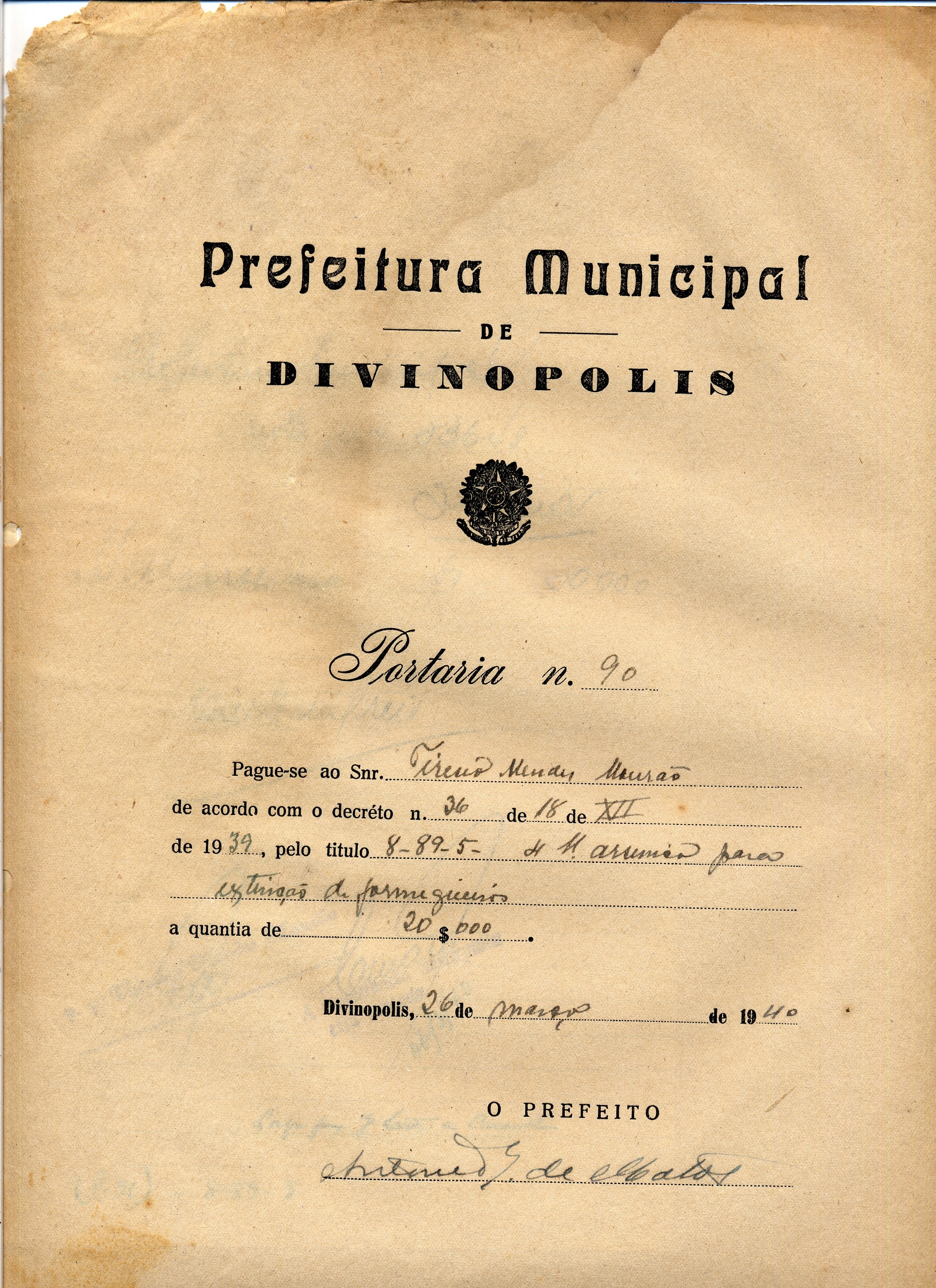 PAGUE-SE AO SNR THIRÉSIO MENDES MOURÃO DE ACORDO COM O DECRETO Nº 36 DE 18 DE XII DE 1939, PELO TÍTULO 8-89-5 - 4 ARSÊNICO PARA EXTINÇÃO DE FORMIGUEIROS A QUANTIA DE 20$000 (VINTE MIL RÉIS)