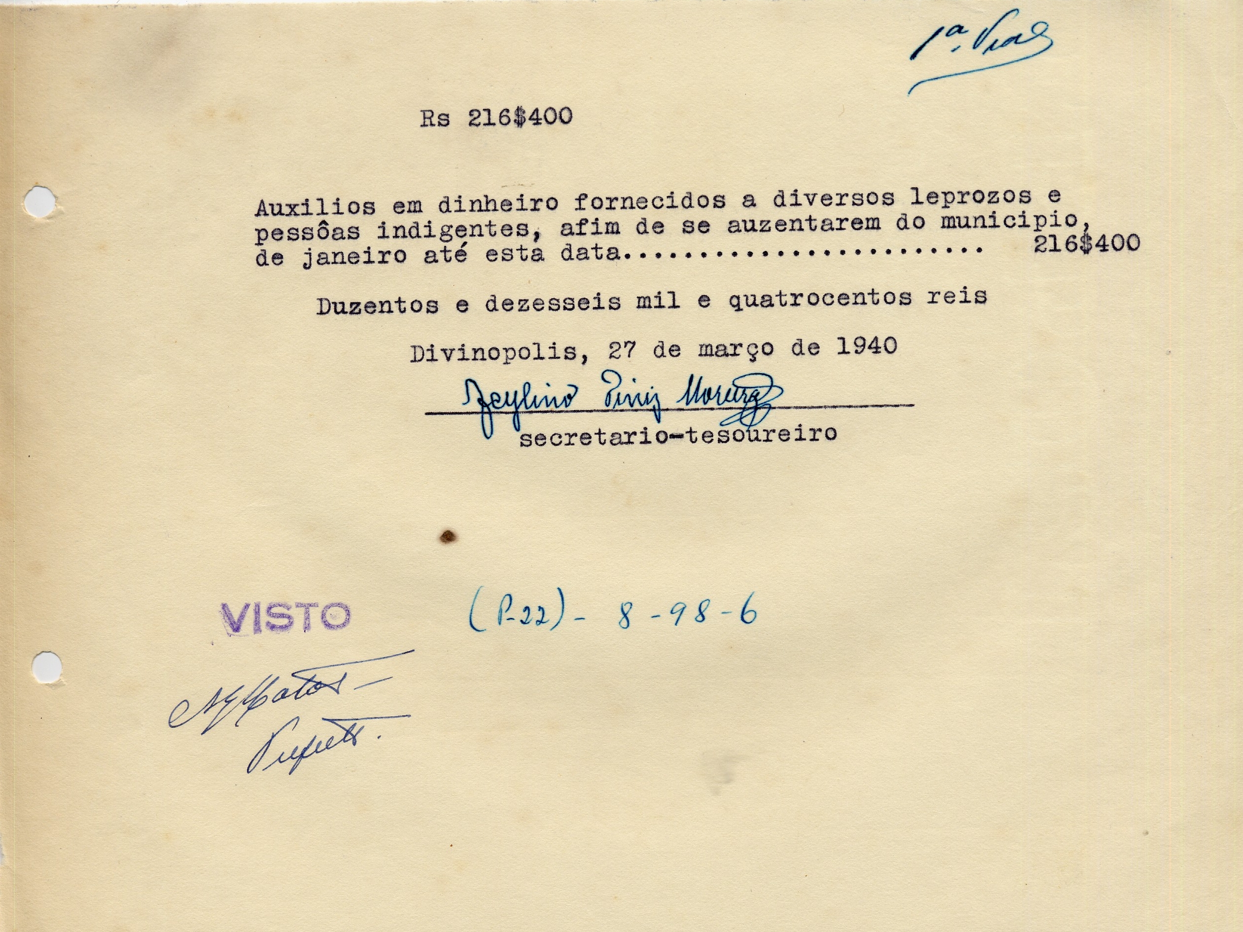 PAGUE-SE AO SNR DIVERSOS DE ACORDO COM O DECRETO Nº 36 DE 18 DE XII DE 1939, PELO TÍTULO 8-98-6- AUXILIAR FORNECIDOS A DIVERSOS LEPROSOS E PESSOAS INDIGENTES P/ SE AUSENTAREM DO MUNICÍPIO A QUANTIA DE 216$400 (DUZENTOS E DEZESSEIS MIL E QUATROCENTOS RÉIS)