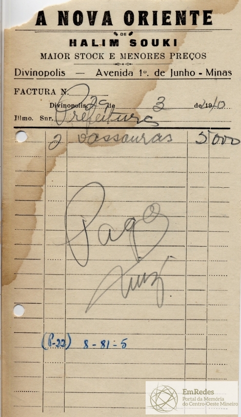 PAGUE-SE AO SNR HALIM SOUKI DE ACORDO COM O DECRETO Nº 36 DE 18 DE XII DE 1939, PELO TÍTULO 8-81-5 - 2 VASSOURAS (MATERIAL Pª SERVIÇO DE CONS. DE RUAS E JARDINS) A QUANTIA DE 5$000 (CINCO MIL RÉIS)