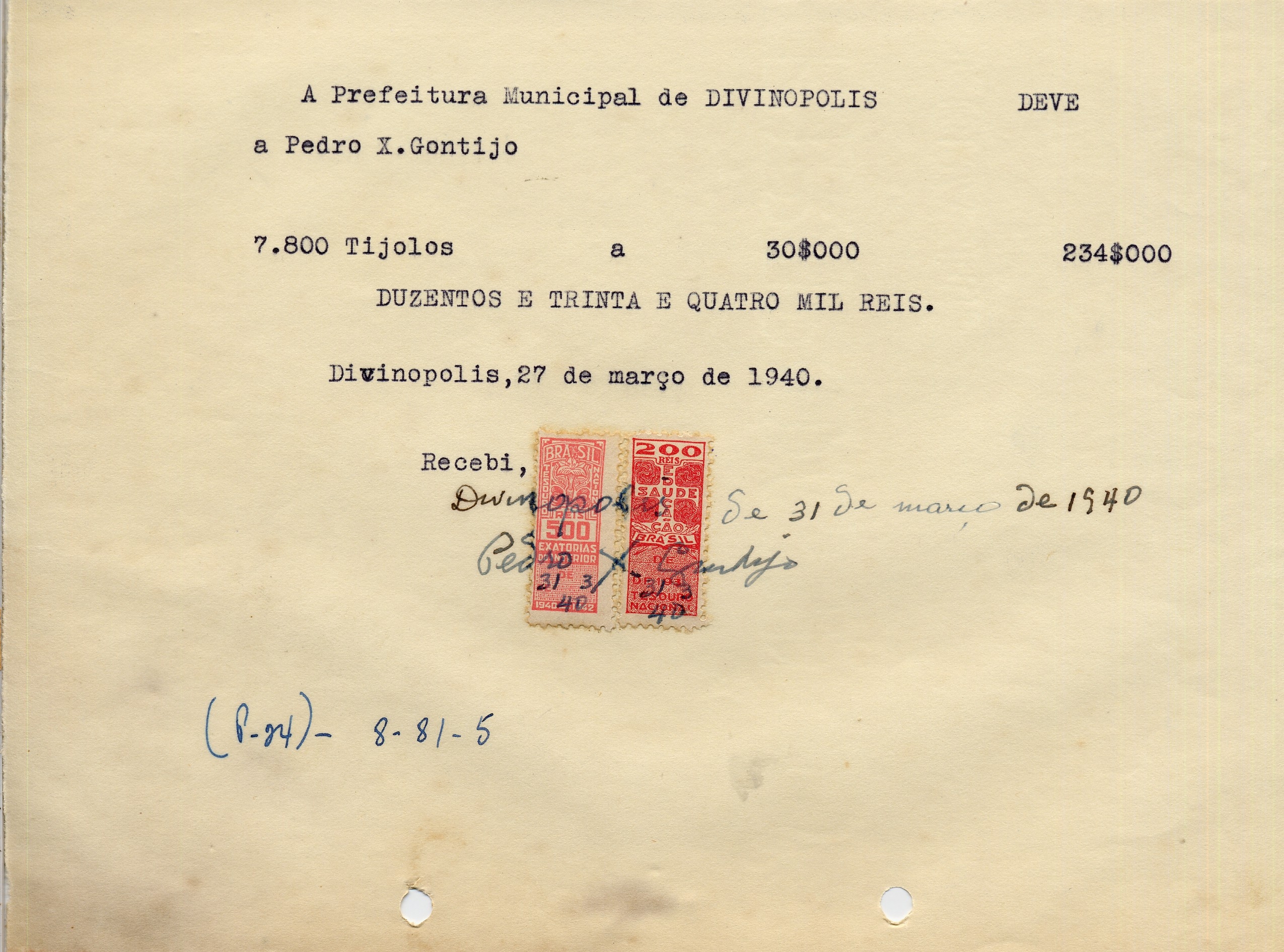 PAGUE-SE AO SNR PEDRO X. GONTIJO DE ACORDO COM O DECRETO Nº 36 DE 18 DE XII DE 1939, PELO TÍTULO 8-81-5 - 7.800 TIJOLOS PARA SERVIÇO DE CONS. DE RUAS E JARDINS, A QUANTIA DE 234$000 (DUZENTOS E TRINTA E QUATRO MIL RÉIS)