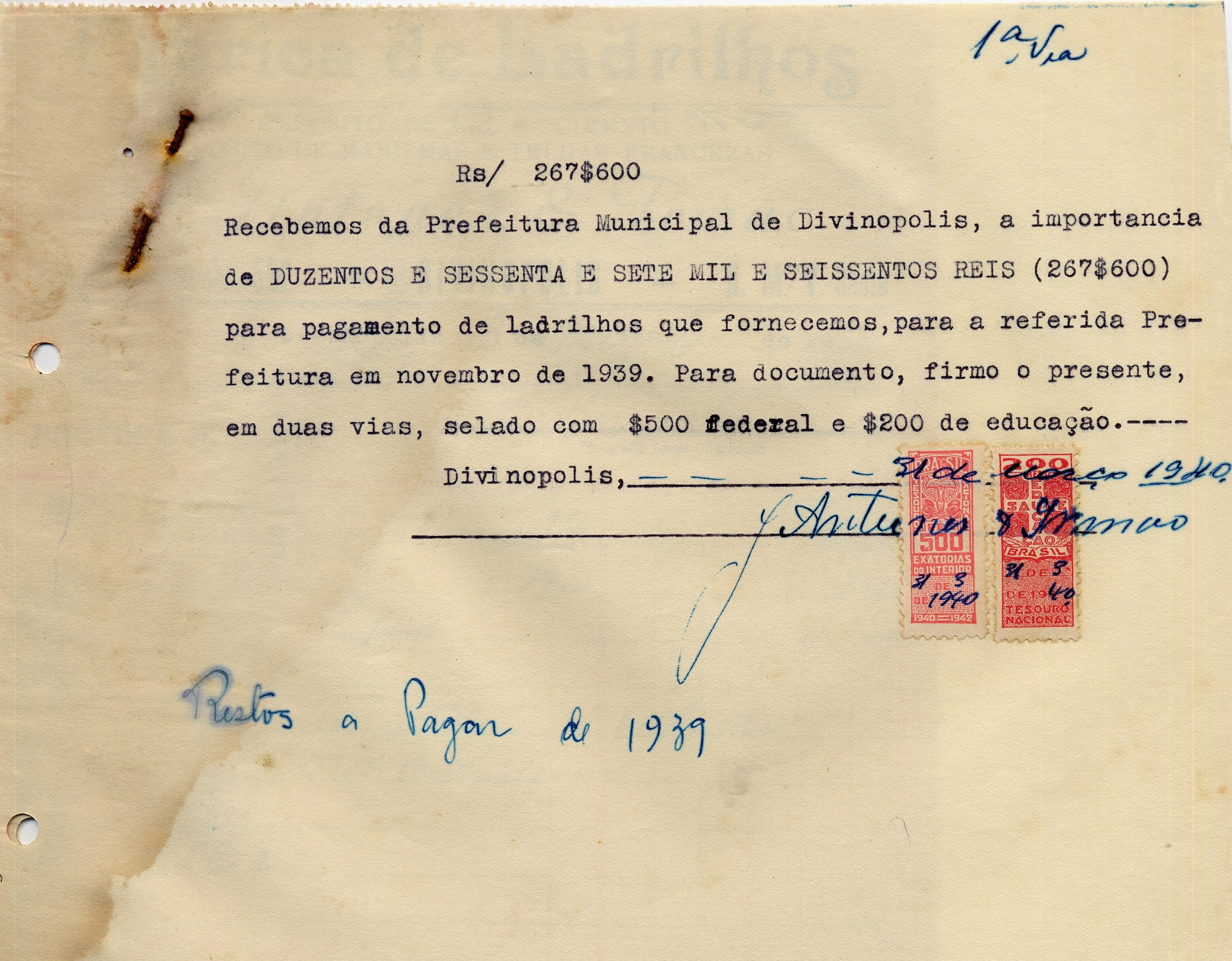 PAGUE-SE AO SNR J. ANTUNES E IRMÃO DE ACORDO COM O DECRETO Nº 36 DE 18 DE XII DE 1939, PELO TÍTULO RESTOS A PAGAR DE 1939 - FORNECIMENTO DE LADRILHOS FAT. DE 13 DE OUTUBRO DE 1939, A QUANTIA DE 267$600 (DUZENTOS E SESSENTA E SETE MIL E SEISCENTOS RÉIS)